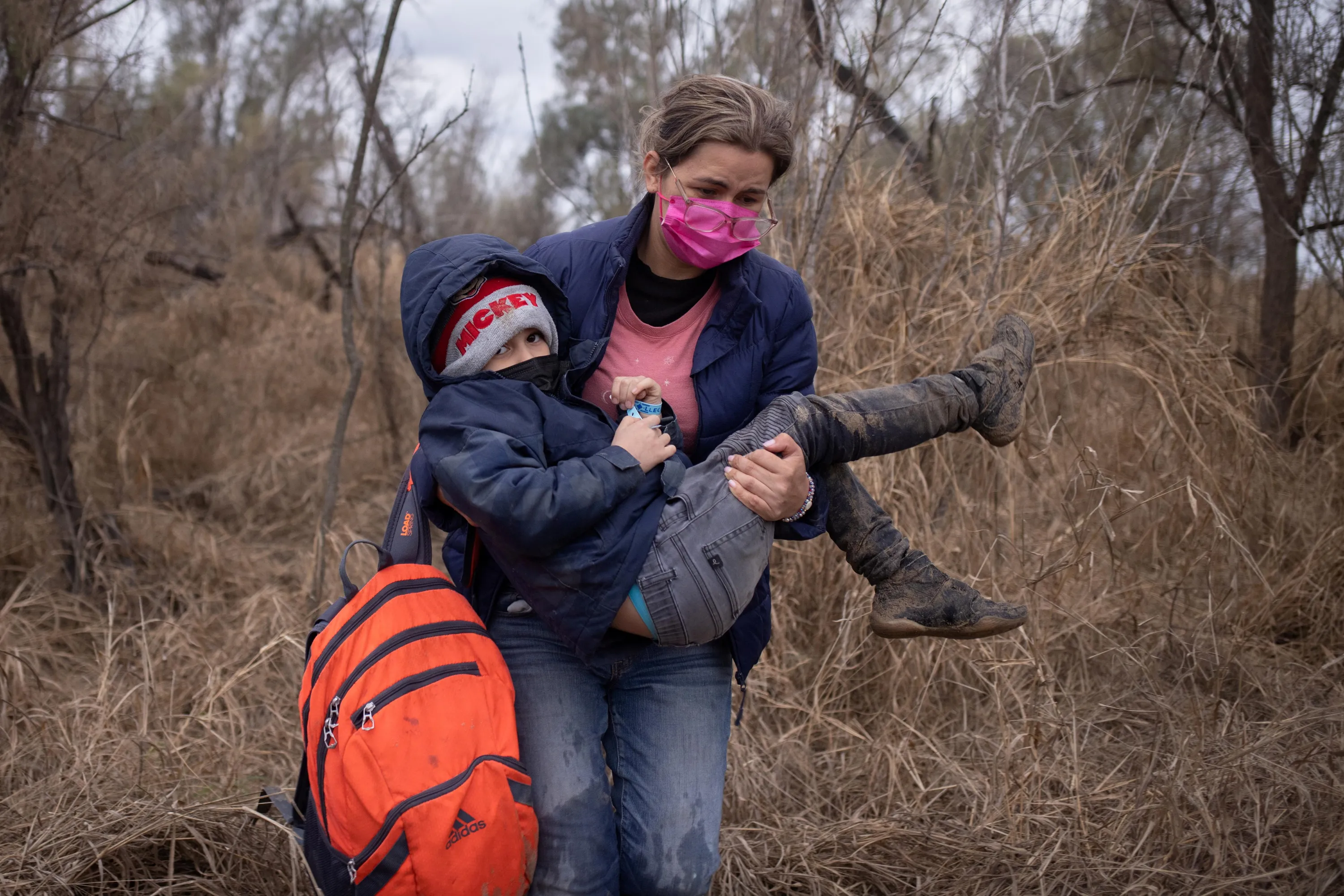 Gabriella, an asylum seeking migrant from Honduras, carries her six year old son Diego as they walk through brush after crossing the Rio Grande river into the United States from Mexico in Penitas, Texas, U.S., March 7, 2021. (Photo by Adrees Latif/Reuters)