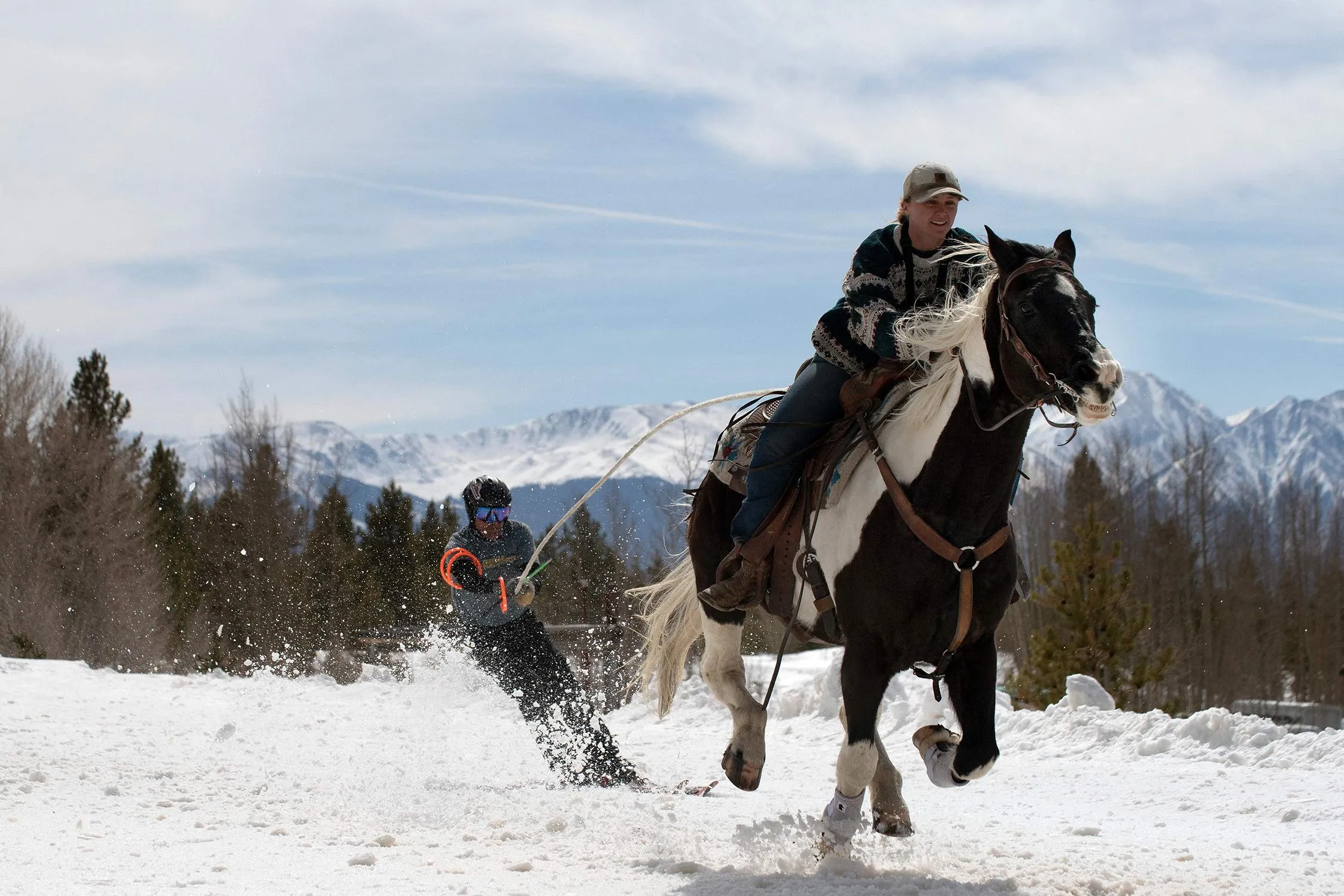 Rider Ali Briggs and skier Jerry Kissell navigate the race course during the 73rd annual Leadville Ski Joring weekend competition on March 7, 2021 in Leadville, Colorado. Skijoring, which has its origins as a competitive sport in Scandinavia, has been adapted over the years to include a team made up of a rider and skier who must navigate jumps, slalom gates, and the spearing of rings for points. In the spirit of the Wild West, and despite the coronavirus pandemic, Leadville continued the annual tradition by relocating the race course from the city center, and not allowing spectators. (Photo by Jason Connolly/AFP Photo)