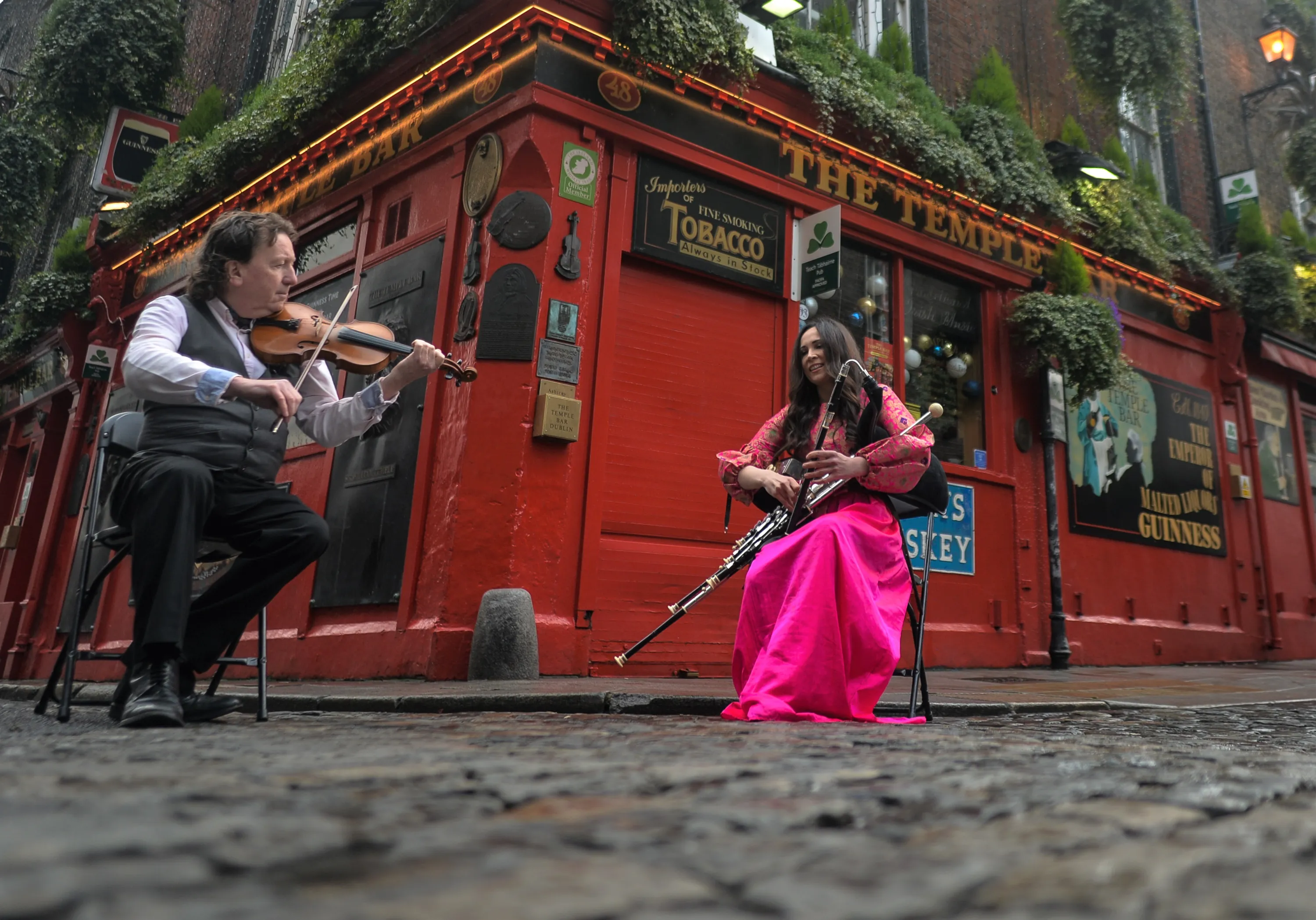 Exactly one year since the Temple Bar Area closed down due to COVID-19 pandemic, world-renowned fiddler Frankie Gavin performs a lament in Dublin's deserted Cultural Quarter in Ireland on Monday, 15 March, 2021. He is joined by piper Louise Mulcahy. (Photo by Artur Widak/NurPhoto/Rex Features/Shutterstock)