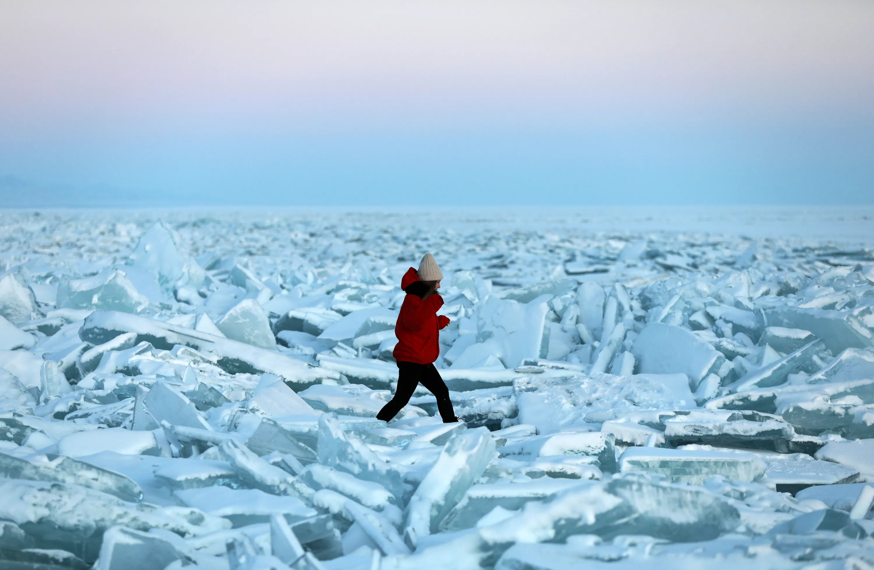 A woman walks through chunks of ice on the frozen Kapchagay reservoir outside Almaty, Kazakhstan on January 14, 2021. (Photo by Pavel Mikheyev/Reuters)