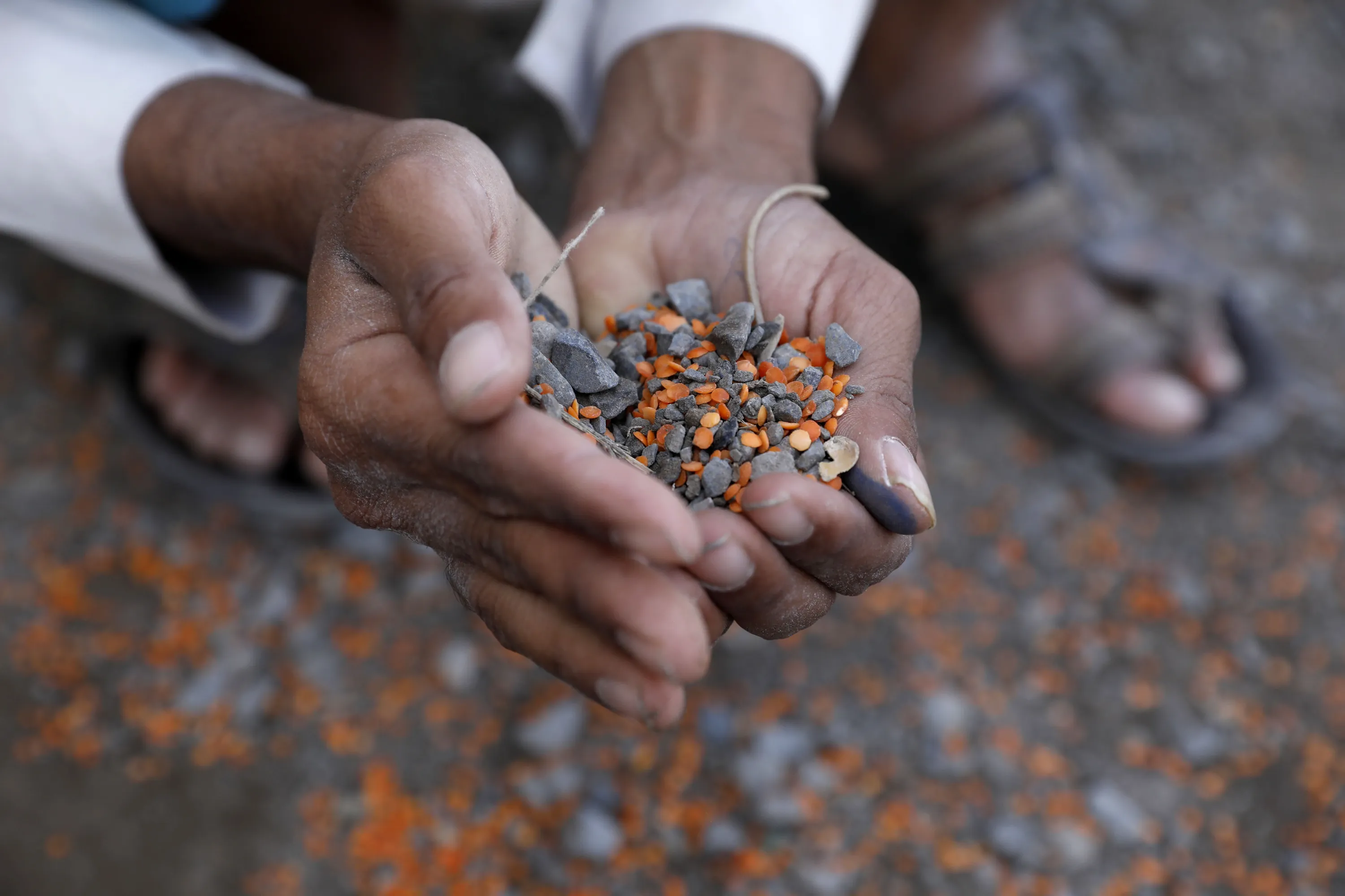 A Yemeni collects grain off the ground split from a bag as he gets his family's food ration provided by a local aid group, Mona Relief Yemen, amid a dire humanitarian crisis, in the western port city of Hodeidah, Yemen, 07 January 2021 (issued 12 January 2021). According to reports, the UN relief agencies have warned that the US administration?s plans to designate the Houthis in Yemen as a terrorist organization will exacerbate what the UN calls the world's worst humanitarian crisis, with 80 percent of the 29-million population lacking sufficient food. Yemen has been the scene of a six-year brutal war between the Saudi-backed Yemeni government and the Houthis, claiming the lives of over 233,000 people. (Photo by Yahya Arhab/EPA/EFE)