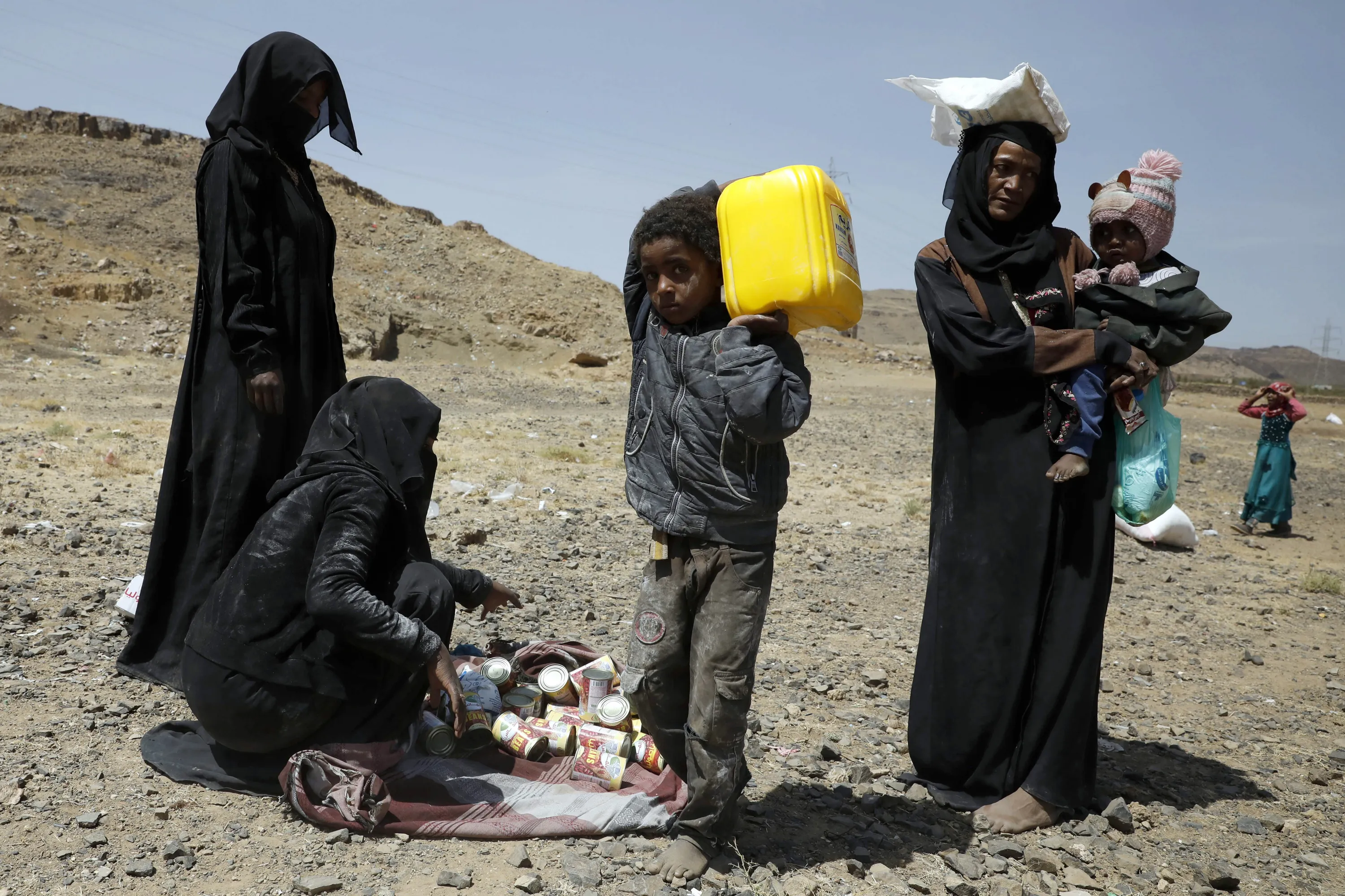Displaced Yemenis get food rations provided by Mona Relief Yemen ahead of an international donors conference on Yemen, at a camp for Internally Displaced Persons (IDPs) in Sana'a, Yemen, 01 March 2021. The United Nations is launching an international donors conference on Yemen Humanitarian Response Plan to address a humanitarian crisis in the war-torn country, warning that over 16 million people, more than half of Yemen's population, would go hungry in 2021, with already some half a million people living in famine-like conditions. (Photo by Yahya Arhab/EPA/EFE)