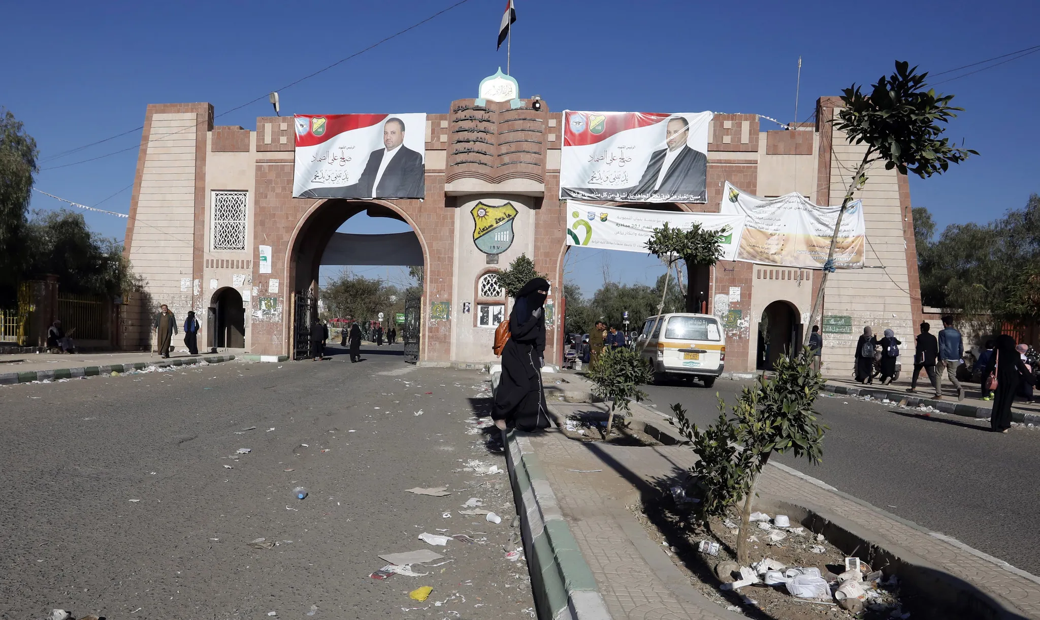 Yemenis pass the main gate of Sana'a University, with banners depicting the portraits of slain top Houthi leader saleh ali al-sammad, where a two-year-long 2011-uprising protest camp was set up, ahead of the tenth anniversary of the uprising, in Sana'a, Yemen, 20 January 2021. Yemen on 27 January 2021 marks the 10th anniversary of the 2011 Arab Spring uprising that toppled the then-president Ali Abdullah Saleh. (Photo by Yahya Arhab/EPA/EFE)