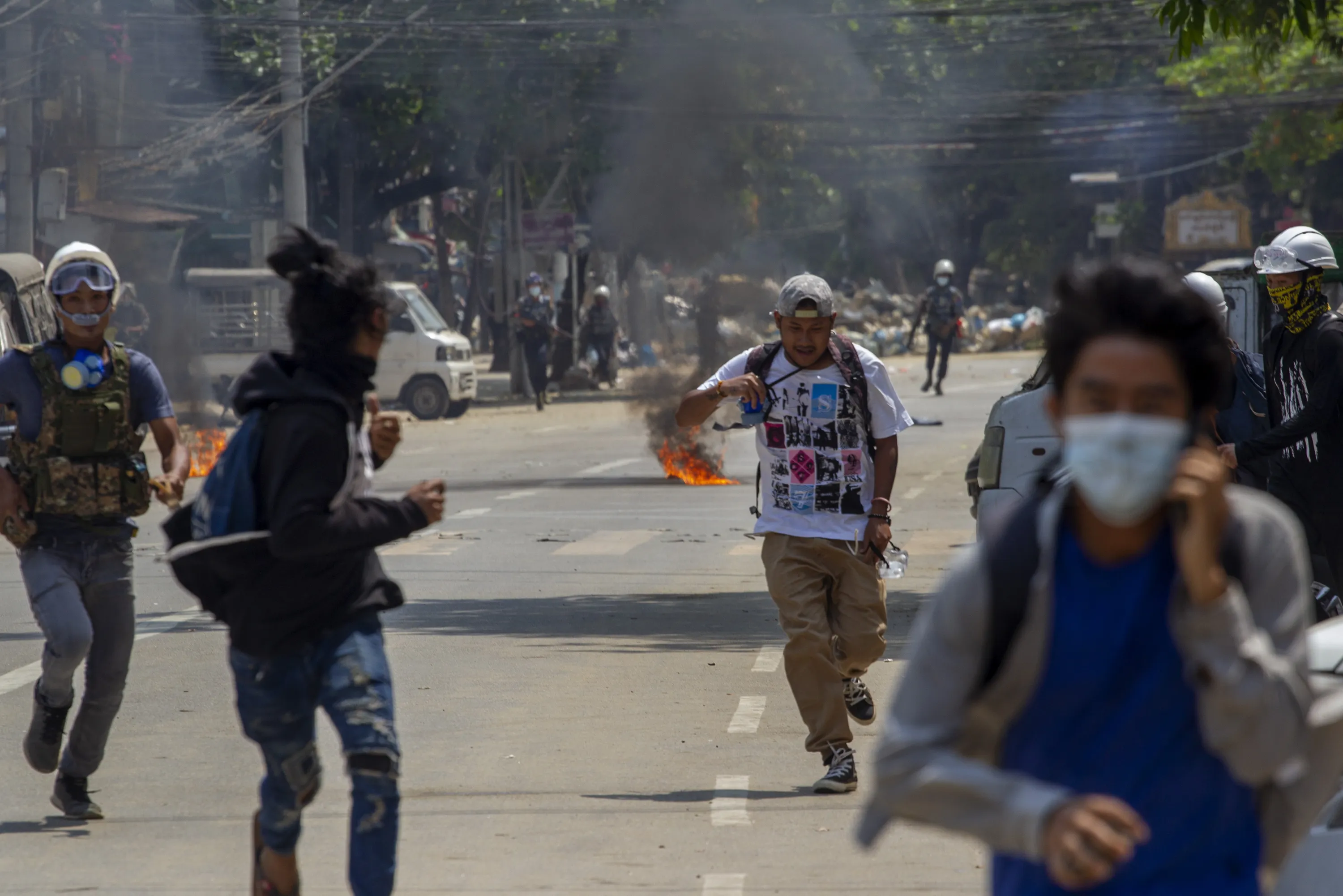 Anti-coup protesters abandon their makeshift barricade and run as armed riot policemen charge in Yangon, Myanmar Tuesday, March 16, 2021. Demonstrators in several areas of Myanmar protesting last month’s seizure of power by the military held small, peaceful marches before dawn Tuesday, avoiding confrontations with security forces who have shot dead scores of their countrymen in the past few days. (Photo by AP Photo/Stringer)