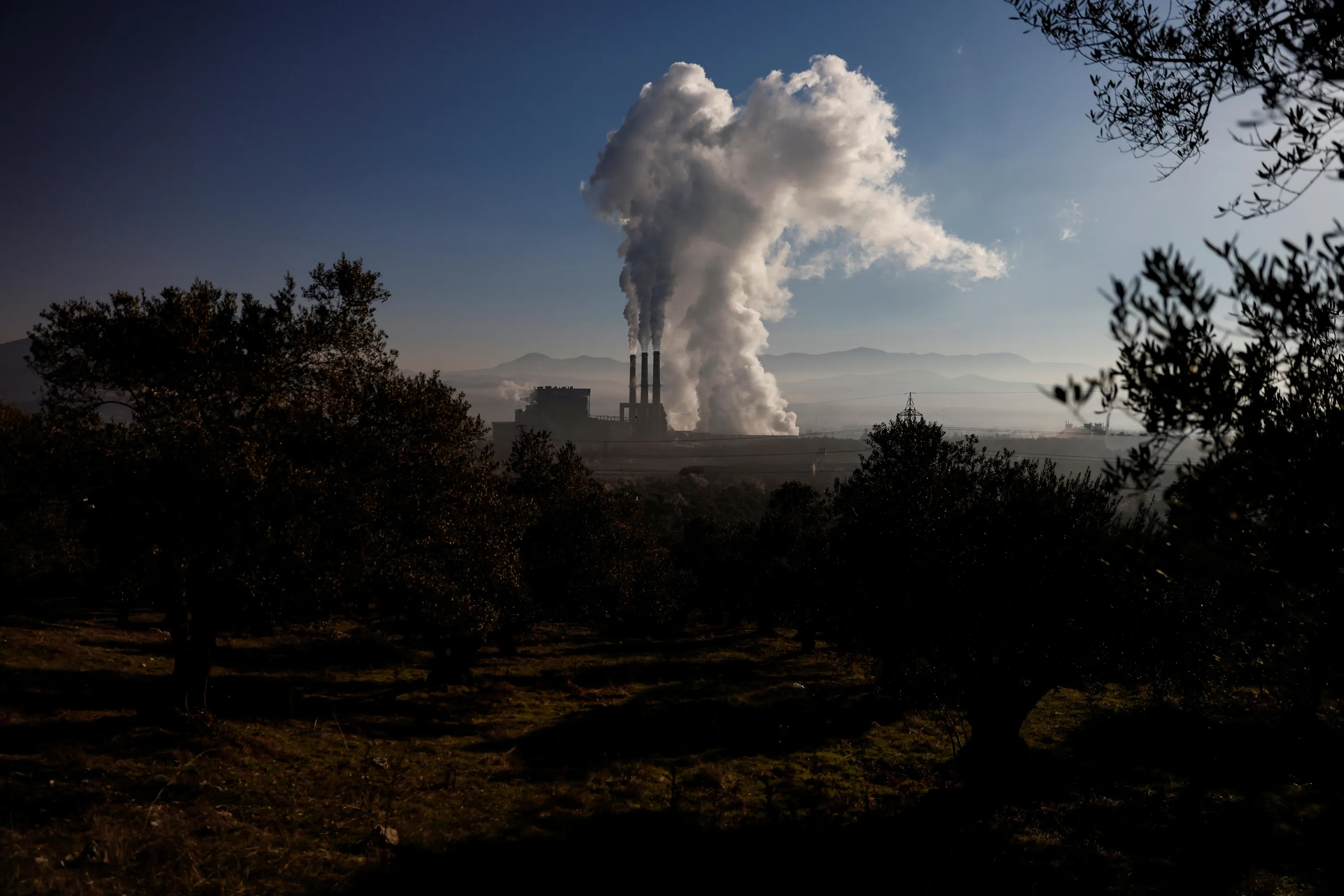 Smoke rises from Yatagan thermal power plant near southwestern town of Yatagan in Mugla province, Turkey, February 24, 2021. Five villages have already disappeared as mines serving the Yatagan power station have expanded, and the village of Turgut is now threatened. Across the province of Mugla 5,000 hectares, the equivalent of nearly 8,000 football fields, has been lost to mining in the last four decades, campaigners say. Asked about its plans to expand the mine, Yatagan Power Plant told Reuters it has planted more than 1.5 million trees in the region and its operations respect the environment and are carried out under supervision of relevant Turkish ministries. (Photo by Umit Bektas/Reuters)