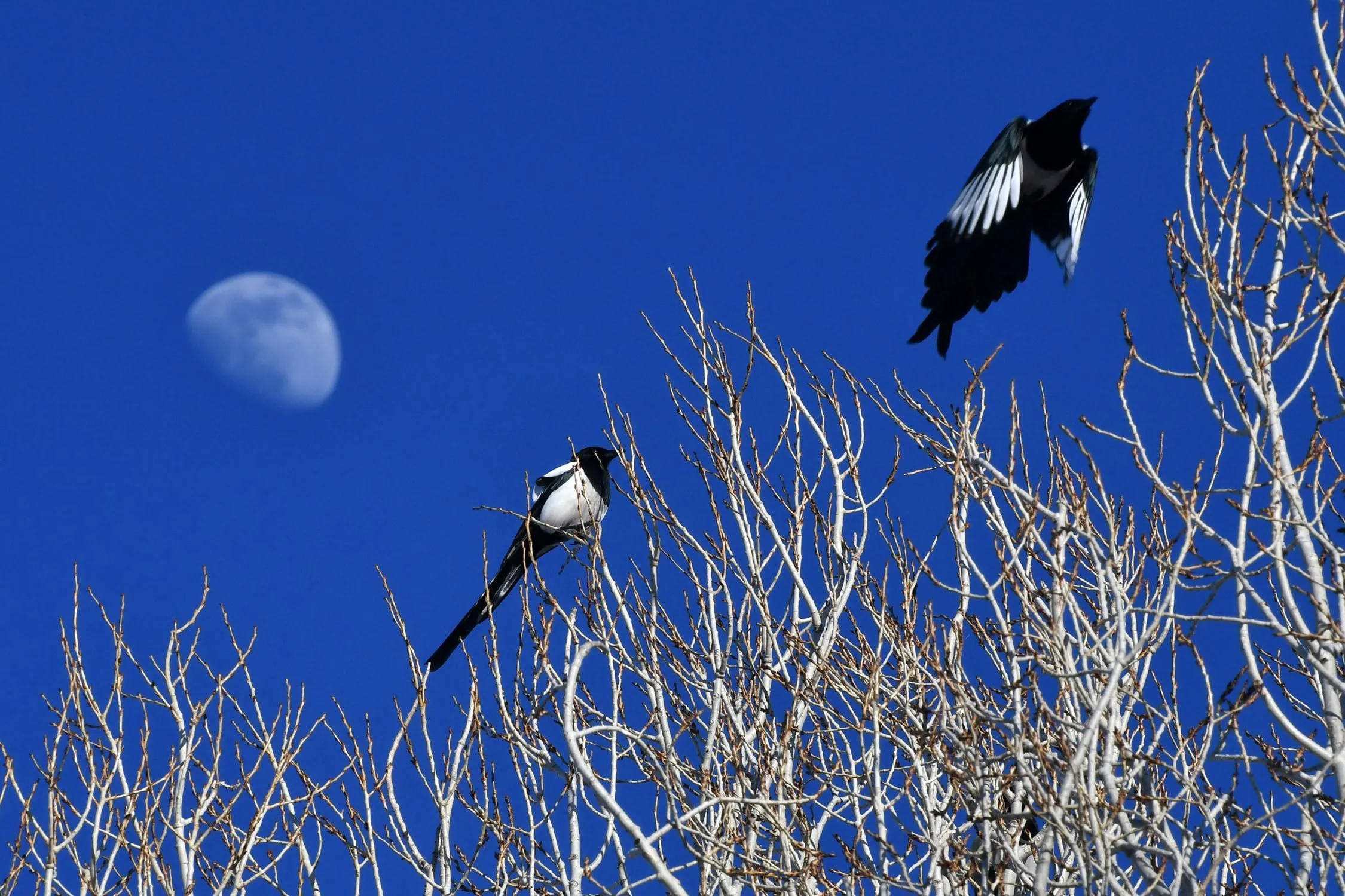 Eurasian magpies are seen over branches of a tree as moon rises over Kars, Turkey on February 22, 2021. (Photo by Huseyin Demirci/Anadolu Agency via Getty Images)