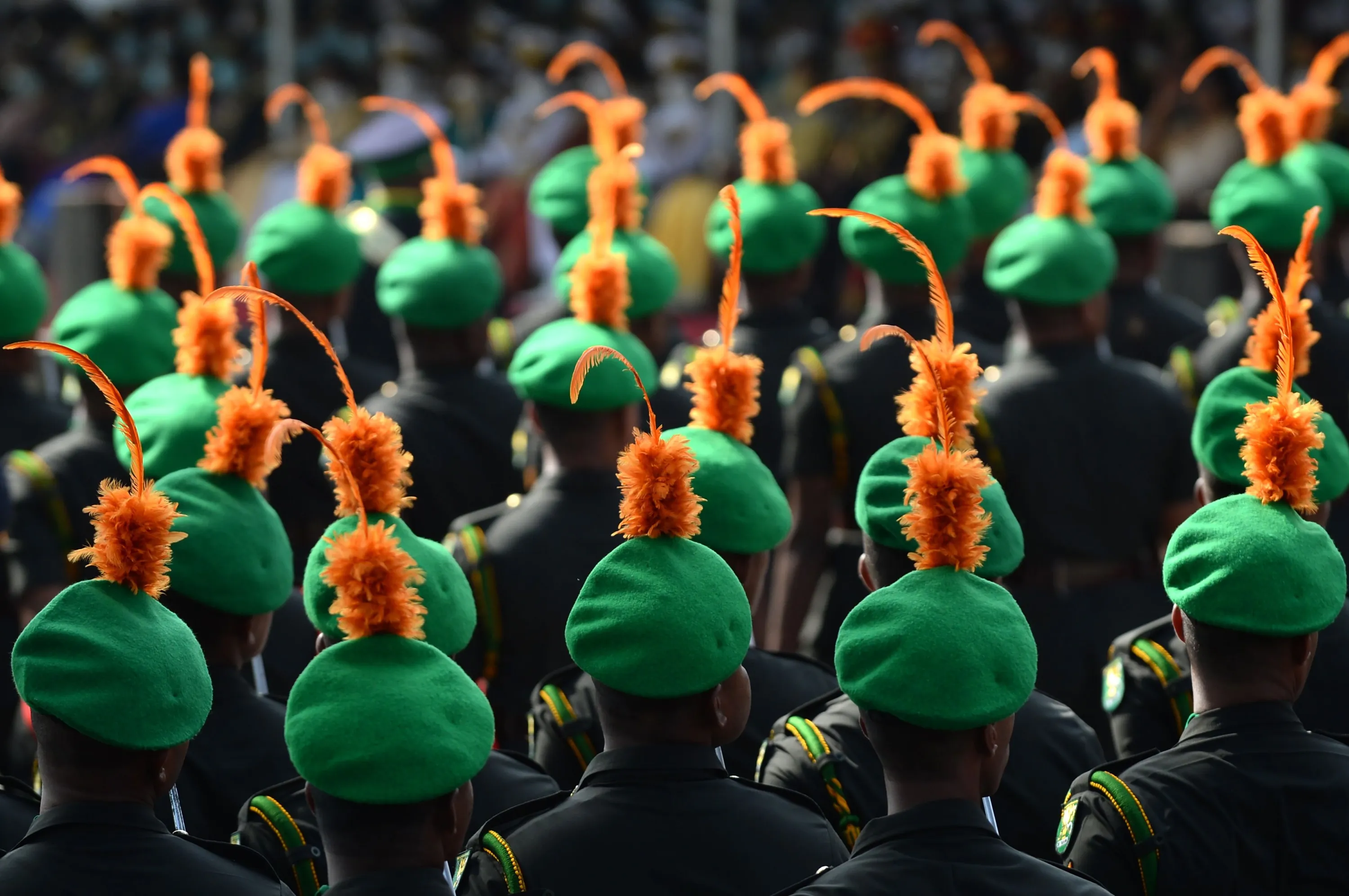 Sri Lankan military personnel march during the Sri Lanka's 73rd Independence Day celebrations in Colombo on February 4, 2021. (Photo by Lakruwan Wanniarachchi/AFP Photo)