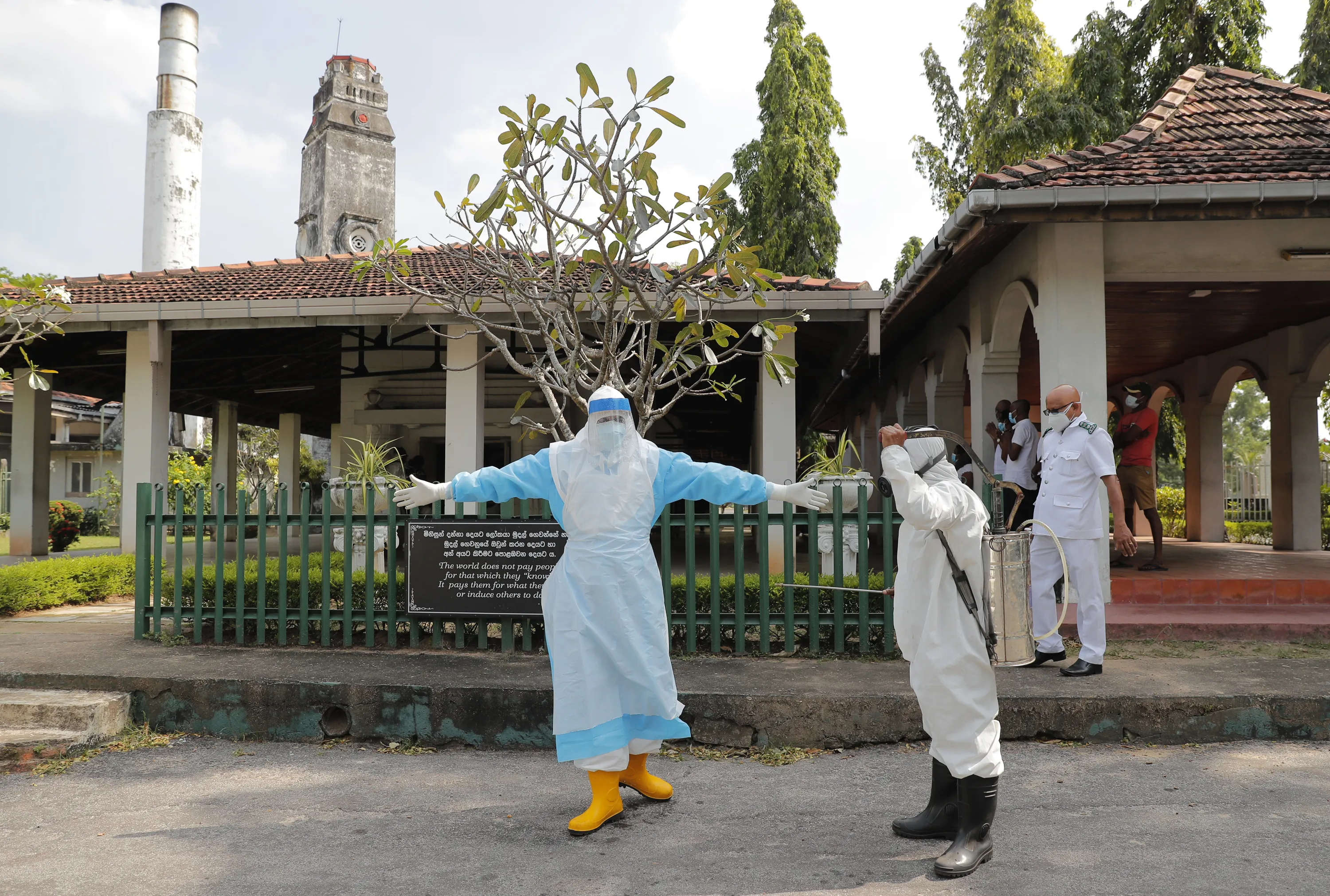 Sri Lankan health workers get disinfected after a cremation of COVID -19 victims at a cemetery in Colombo, Sri Lanka, Wednesday, February 10, 2021. (Photo by Eranga Jayawardena/AP Photo)