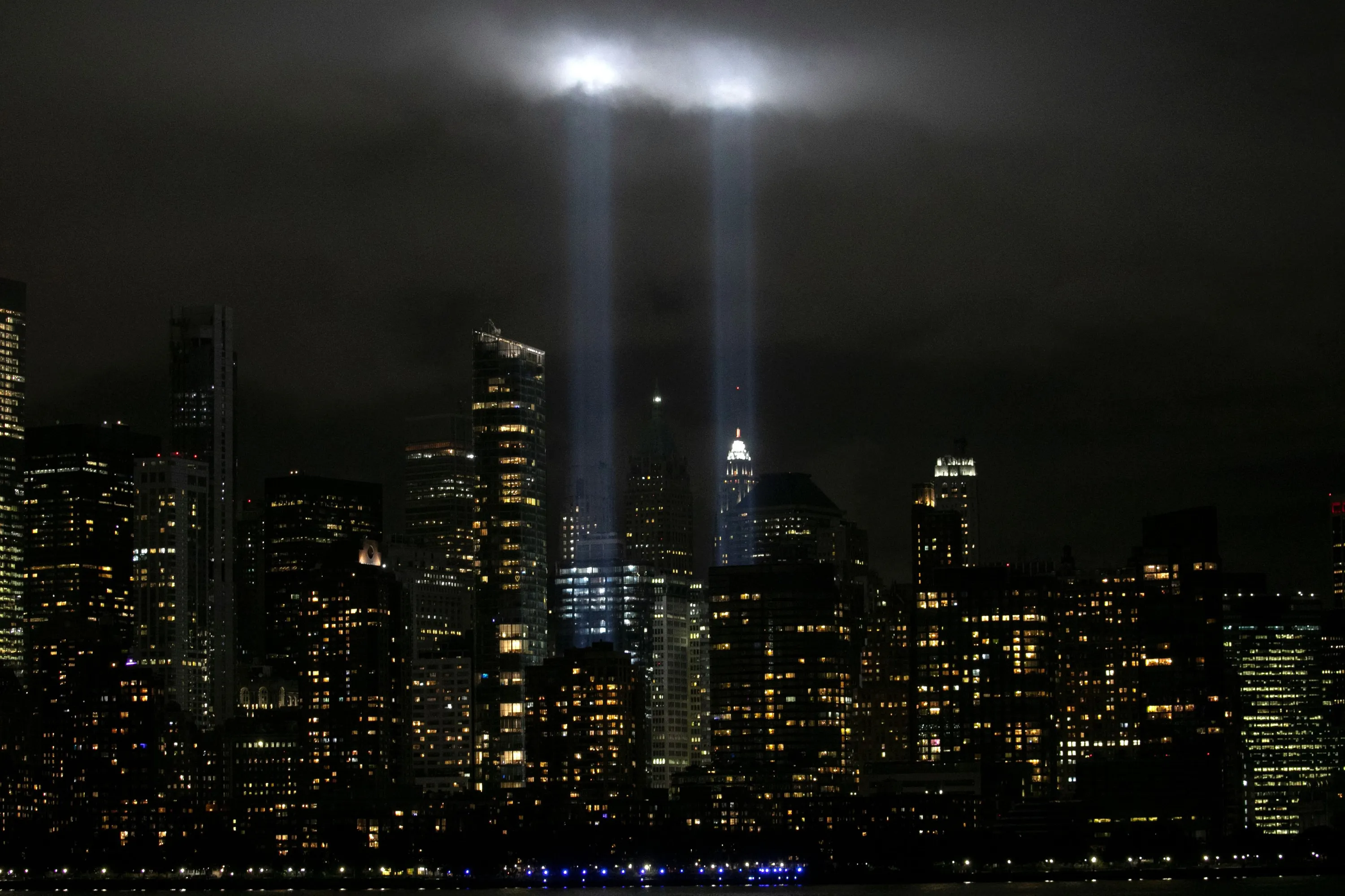 The Tribute In Light shines above the skyline of lower Manhattan on the eve of the 19th anniversary of the September 11, 2001 attacks on the World Trade Center in New York City, as seen from Jersey City, New Jersey, U.S., September 10, 2020. (Photo by Mike Segar/Reuters)