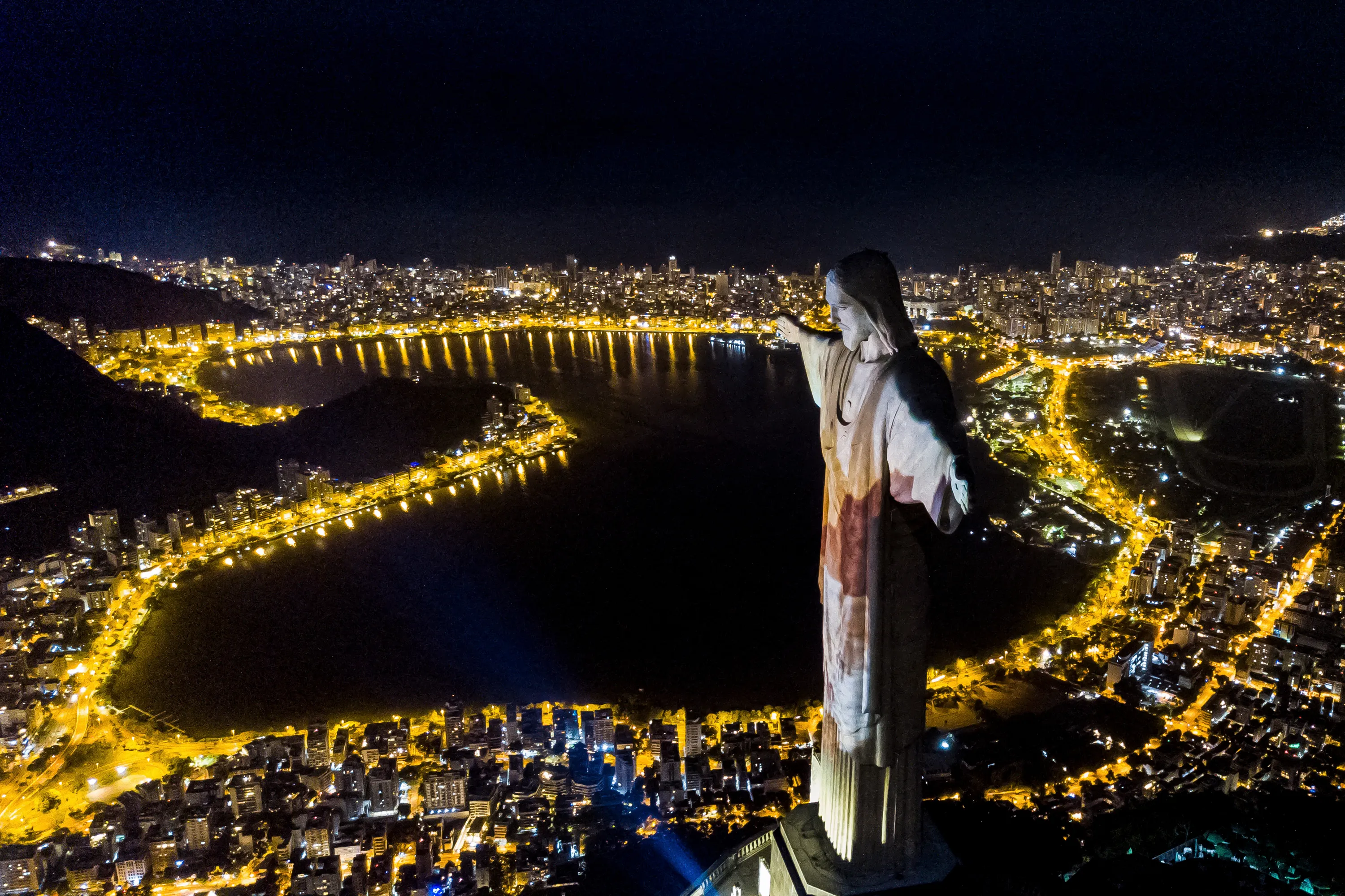 Aerial view of the illuminated statue of Christ the Redeemer in a honor of the medical workers amidst the Coronavirus (COVID-19) pandemic on December 31, 2020 in Rio de Janeiro, Brazil. The city of Rio de Janeiro decided to close the beaches to avoid crowds due to the coronavirus (COVID-19) pandemic. Sound equipment, car parking, beach vendors and fireworks have been prohibited on the shore at the turn of the year. About 10,000 military police officers and teams from the Municipal Guard will act to try to maintain order. (Photo by Buda Mendes/Getty Images)