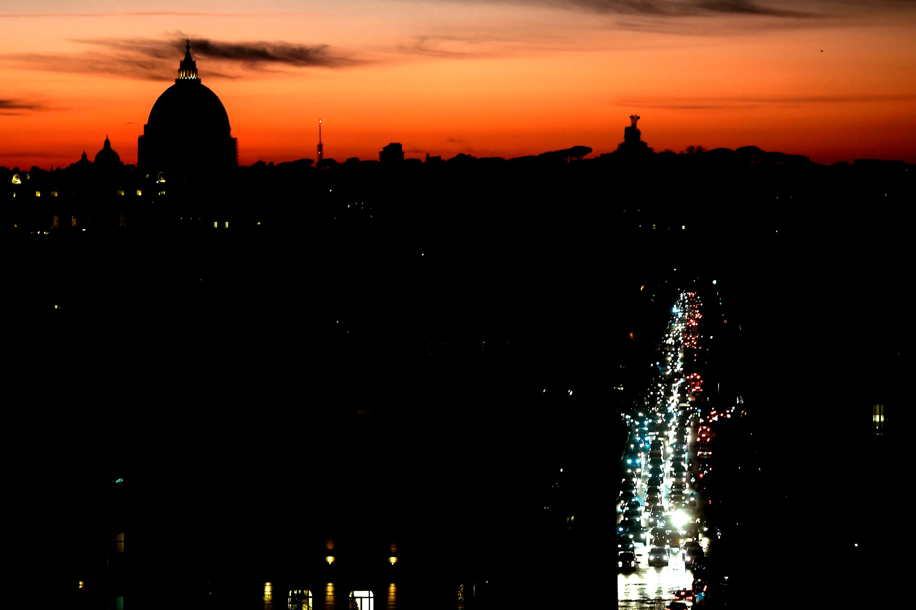 A photograph taken from the Pincino hill, at sunset on December 21, 2020 shows cars queuing in a traffic jam with Saint Peter's Dome in the background on the day of the winter solstice, in Rome. (Photo by Filippo Monteforte/AFP Photo)