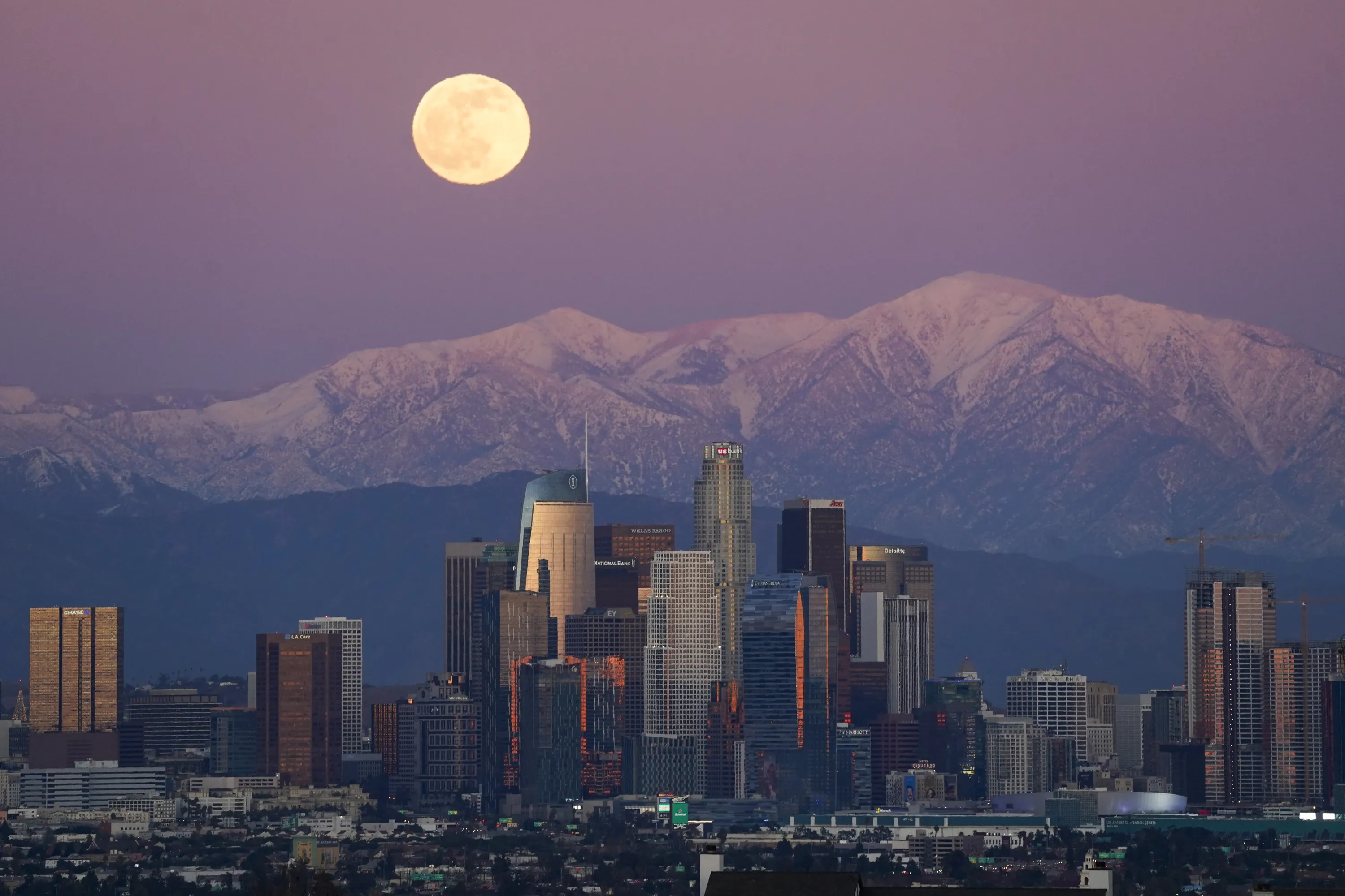 The moon rises over snow covered mountains, behind the downtown Los Angeles skyline Tuesday, December 29, 2020, in Los Angeles. (Photo by Ashley Landis/AP Photo)