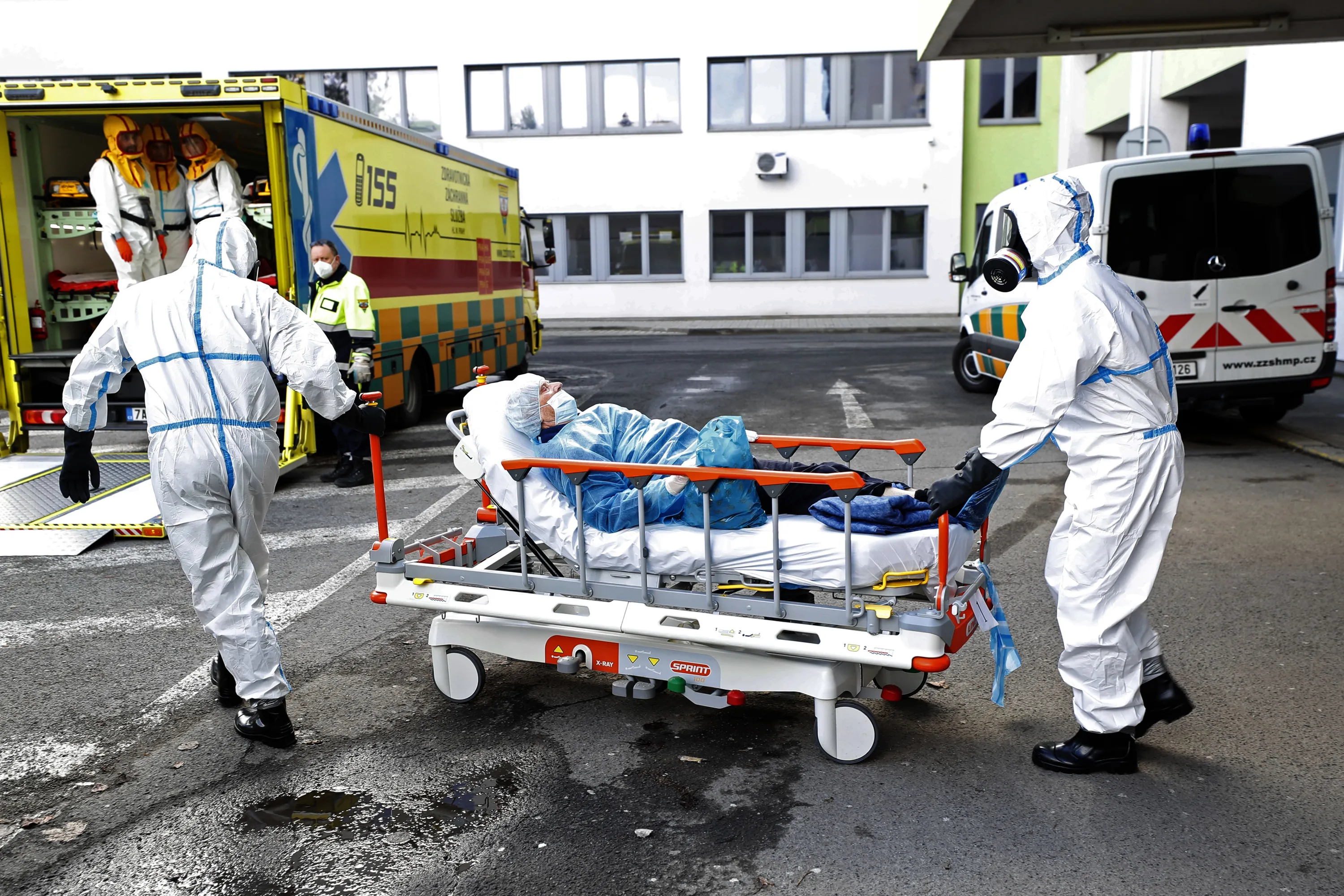 Health care workers assist COVID-19 patient during a transport from a overrun hospital in Ceska Lipa, Czech Republic, Thursday, March 18, 2021. Some patients are being moved from over-run hospitals, as coronavirus puts pressure on health care services. (Photo by Petr David Josek/AP Photo)