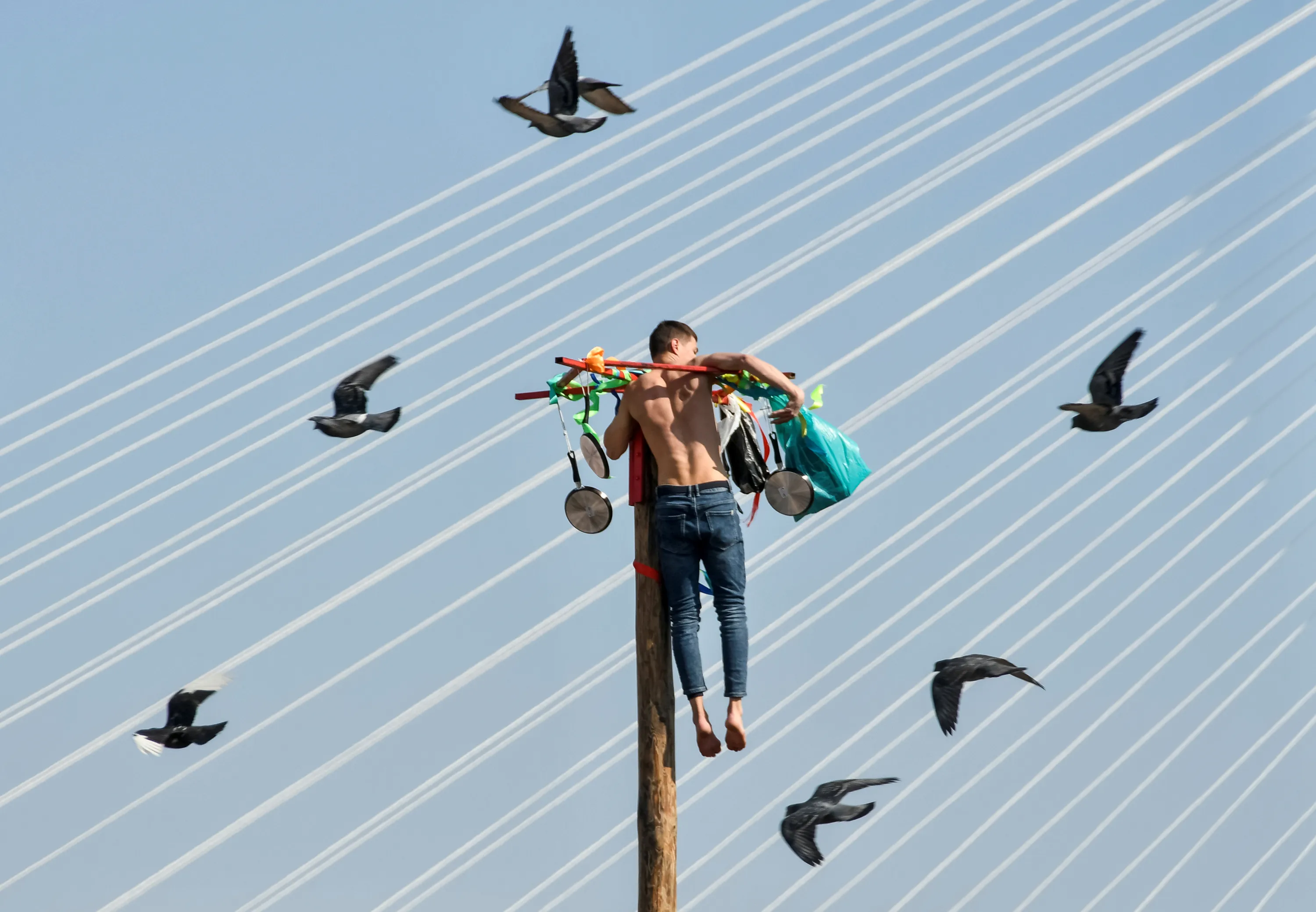 A man climbs up a wooden pole to get a prize during celebrations of Maslenitsa, also known as Pancake Week, which is a pagan holiday marking the end of winter, in Russia's far eastern city of Vladivostok, Russia on March 14, 2021. (Photo by Yuri Maltsev/Reuters)