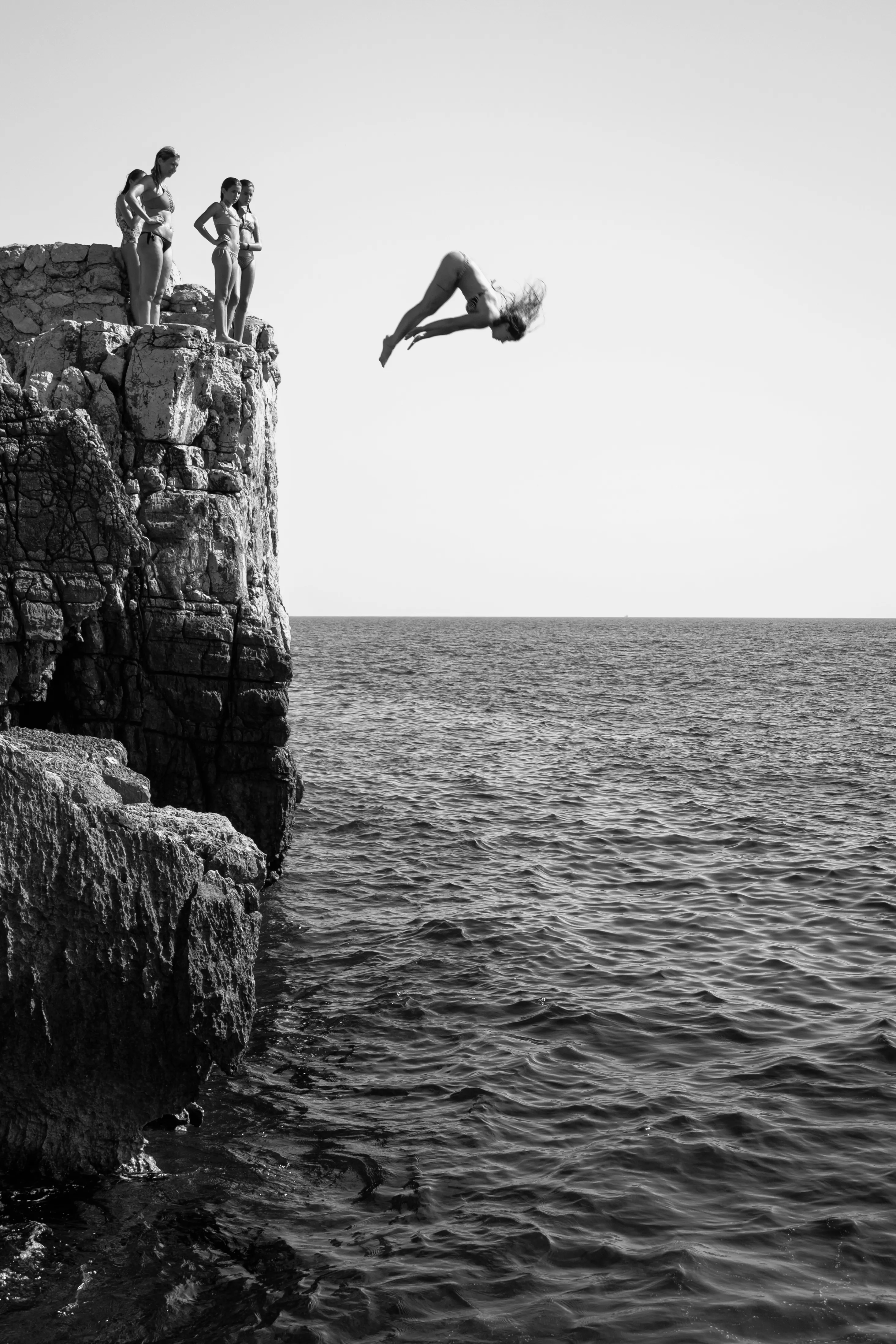 Category winner, open competition, motion. Girl Power, a black-and-white photograph recording the moment when a woman dives off a cliff on the island of Lokrum near Dubrovnik, Croatia, while her friends stand and watch. (Photo by Marijo Maduna/Sony World Photography Awards)