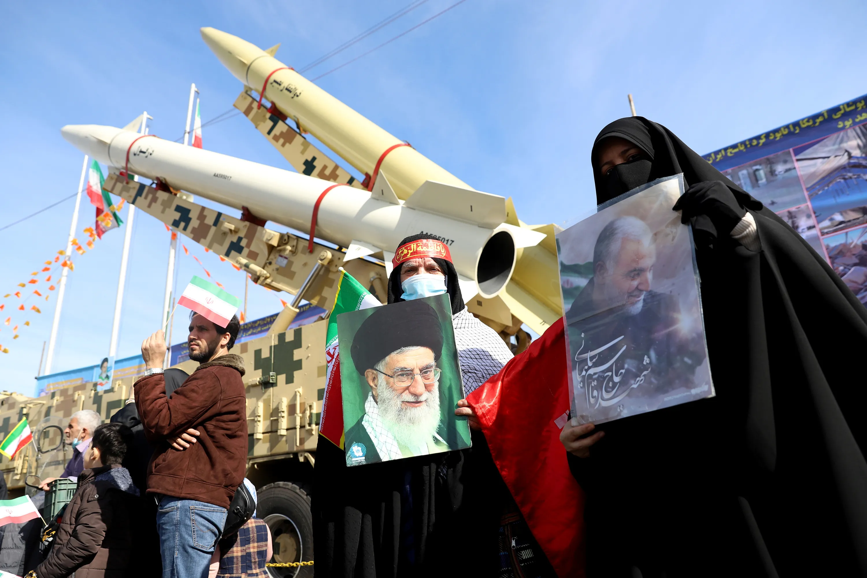 Iranian women hold pictures of the Supreme Leader Ayatollah Ali Khamenei and the late Iranian Major-General Qassem Soleimani, during the celebration of the 42nd anniversary of the Islamic Revolution in Tehran, Iran on February 10, 2021. (Photo by Majid Asgaripour/WANA (West Asia News Agency) via Reuters)