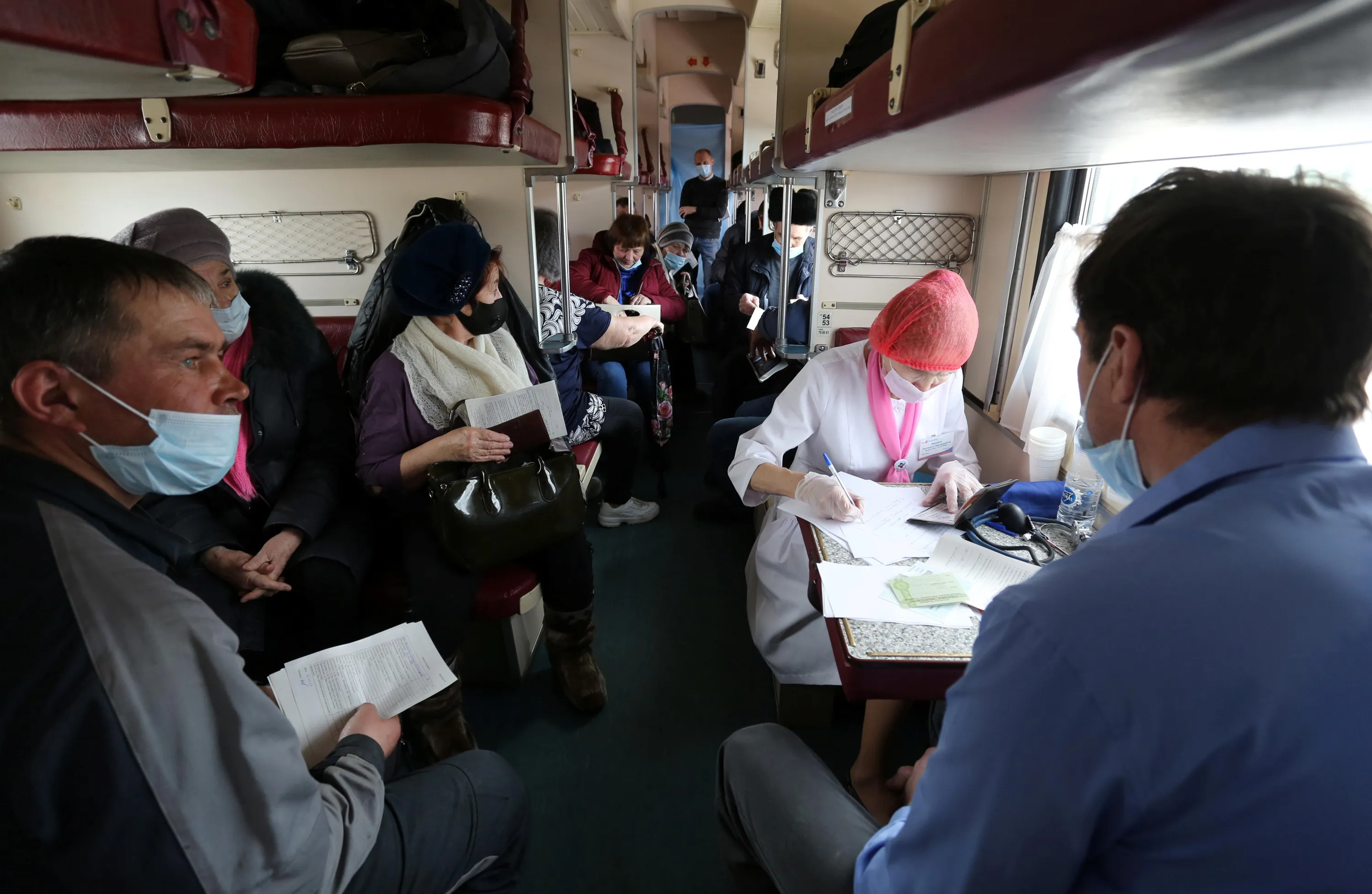 People wait to receive the Sputnik V vaccine against the coronavirus in a carriage of the Academician Fyodor Uglov medical train, at a railway station in the town of Tulun in Irkutsk Region, Russia on March 16, 2021. (Photo by Evgeny Kozyrev/Reuters)
