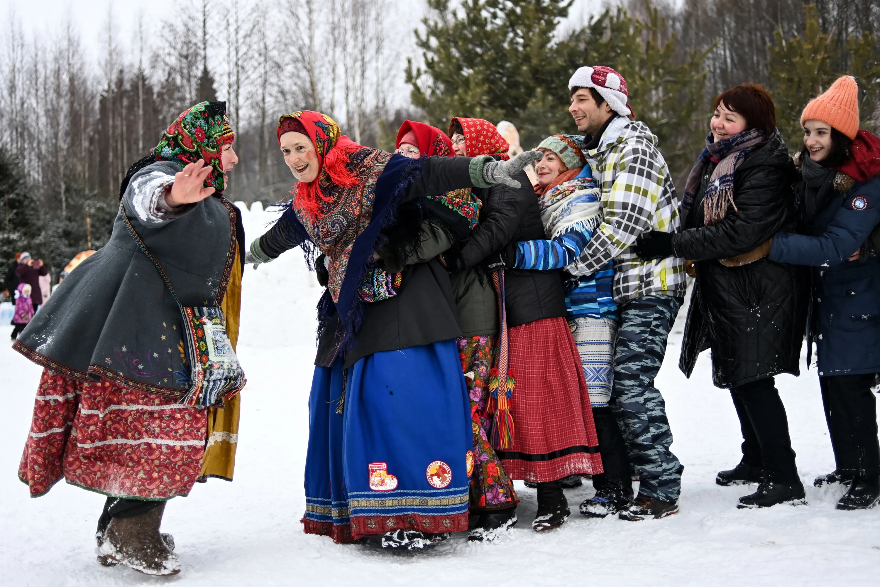Russian traditionaly dressed people celebrate the Maslenitsa or Shrovetide, a farewell ceremony to winter close to village of Gzhel about 60 km from Moscow on March 14, 2021. Shrovetide precedes the beginning of Lent, with each day of the week holding its own meaning. Shrove Sunday, also known as the Sunday of Forgiveness, is a day for asking forgiveness for the harm caused to other people intentionally or unintentionally (Photo by Kirill Kudryavtsev/AFP Photo)