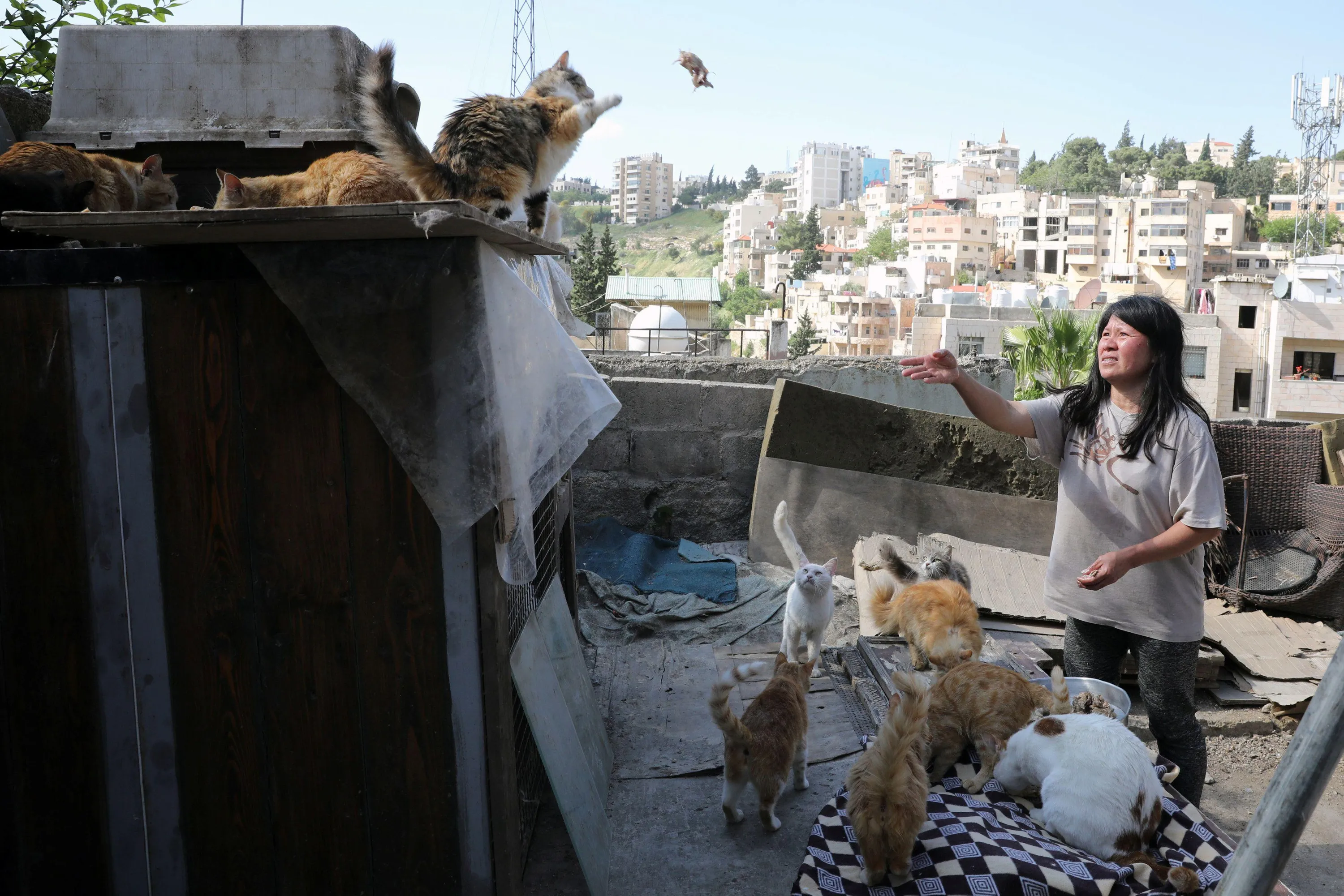 Brenda Kasen of Philippines, who has been living in Jordan for 16 years and lost her job as a babysitter due to concerns over the coronavirus, feeds street cats that gather during mealtime at her home in Amman, Jordan, April 23, 2020. (Photo by Muhammad Hamed/Reuters)