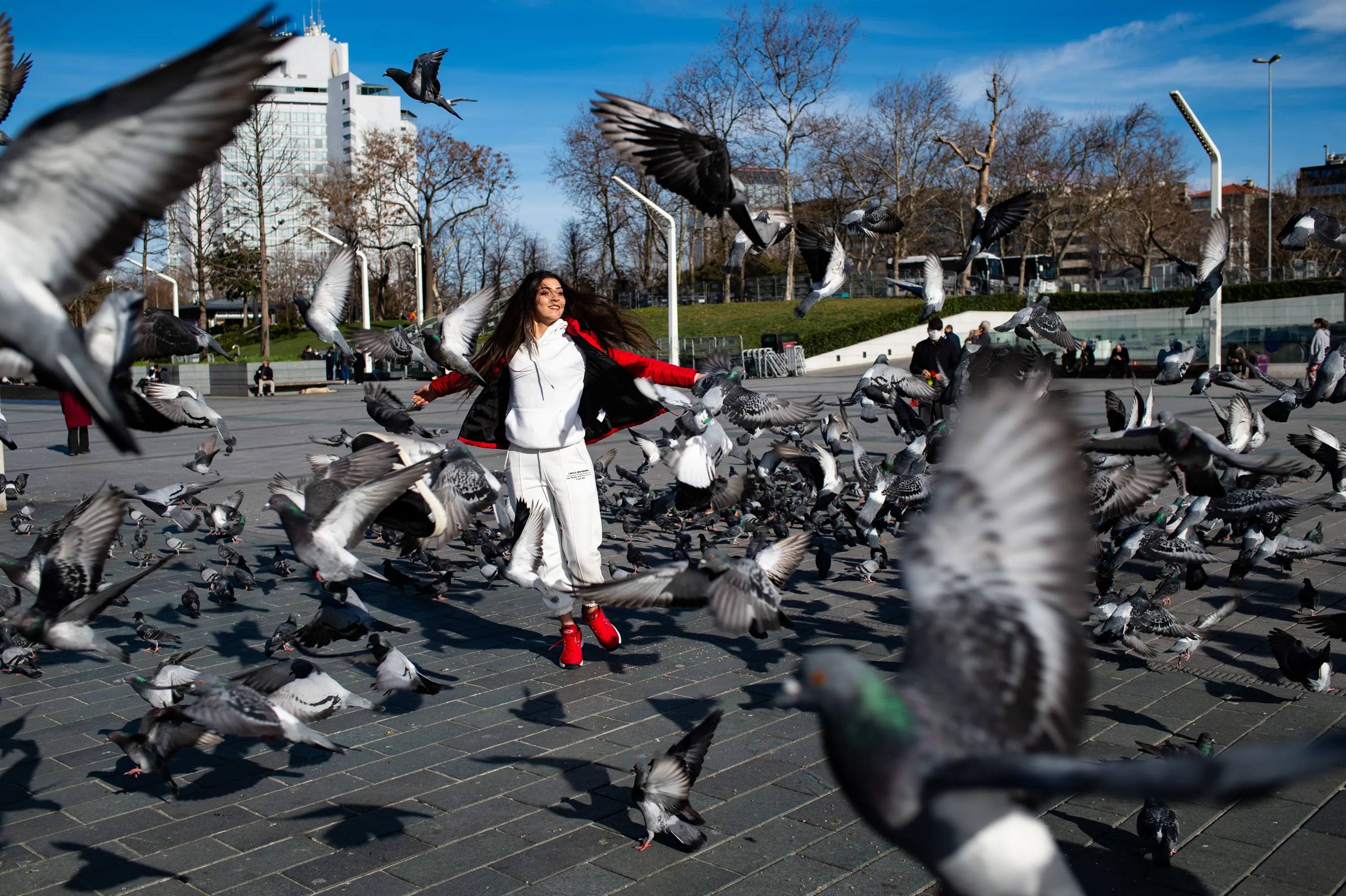 A woman raises her arms among the pigeons on Taksim square during a two-day curfew to limit the spread of the Covid-19 disease in Istanbul, on January 31, 2021. (Photo by Yasin Akgul/AFP Photo)