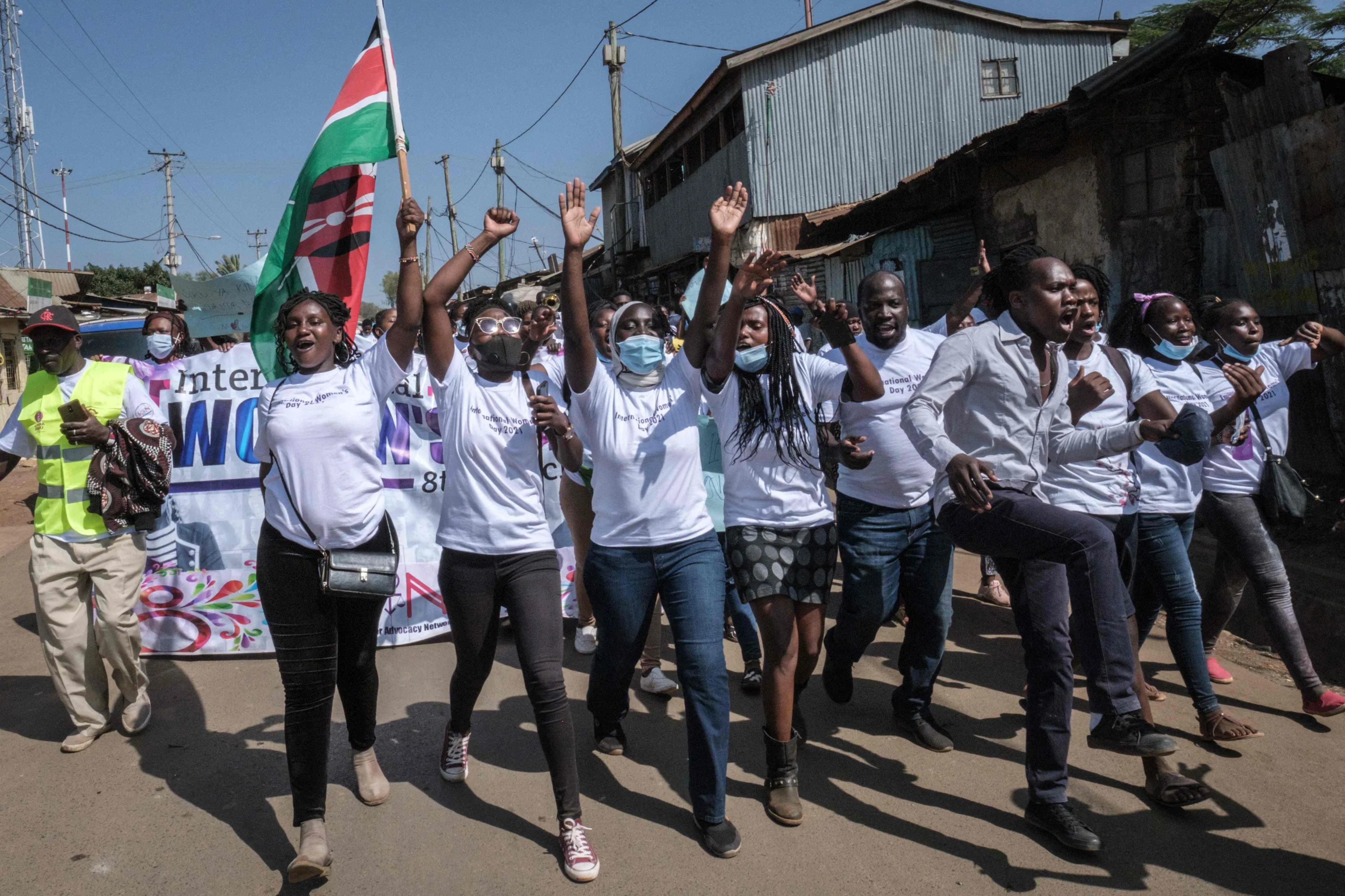 Women human rights defenders from 26 community based organisations march to commemorate International Women's Day in Kibera, Nairobi, on March 8, 2021. (Photo by Yasuyoshi Chiba/AFP Photo)