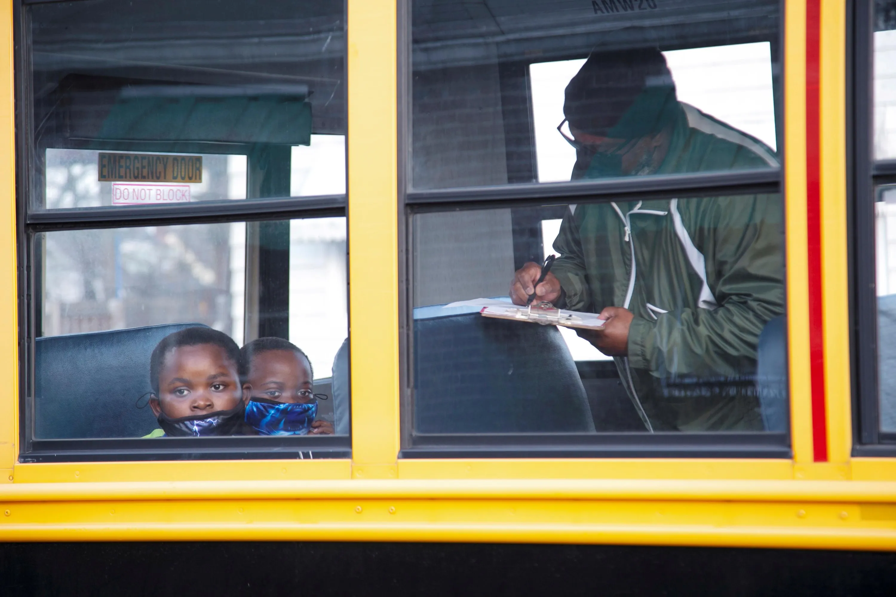 The bus driver verifies the names of Esther Bahome and Mmema Mkangya on their first day back to school after coronavirus disease (COVID-19) restrictions were adjusted, in Louisville, Kentucky, U.S. March 17, 2021. (Photo by Amira Karaoud/Reuters)