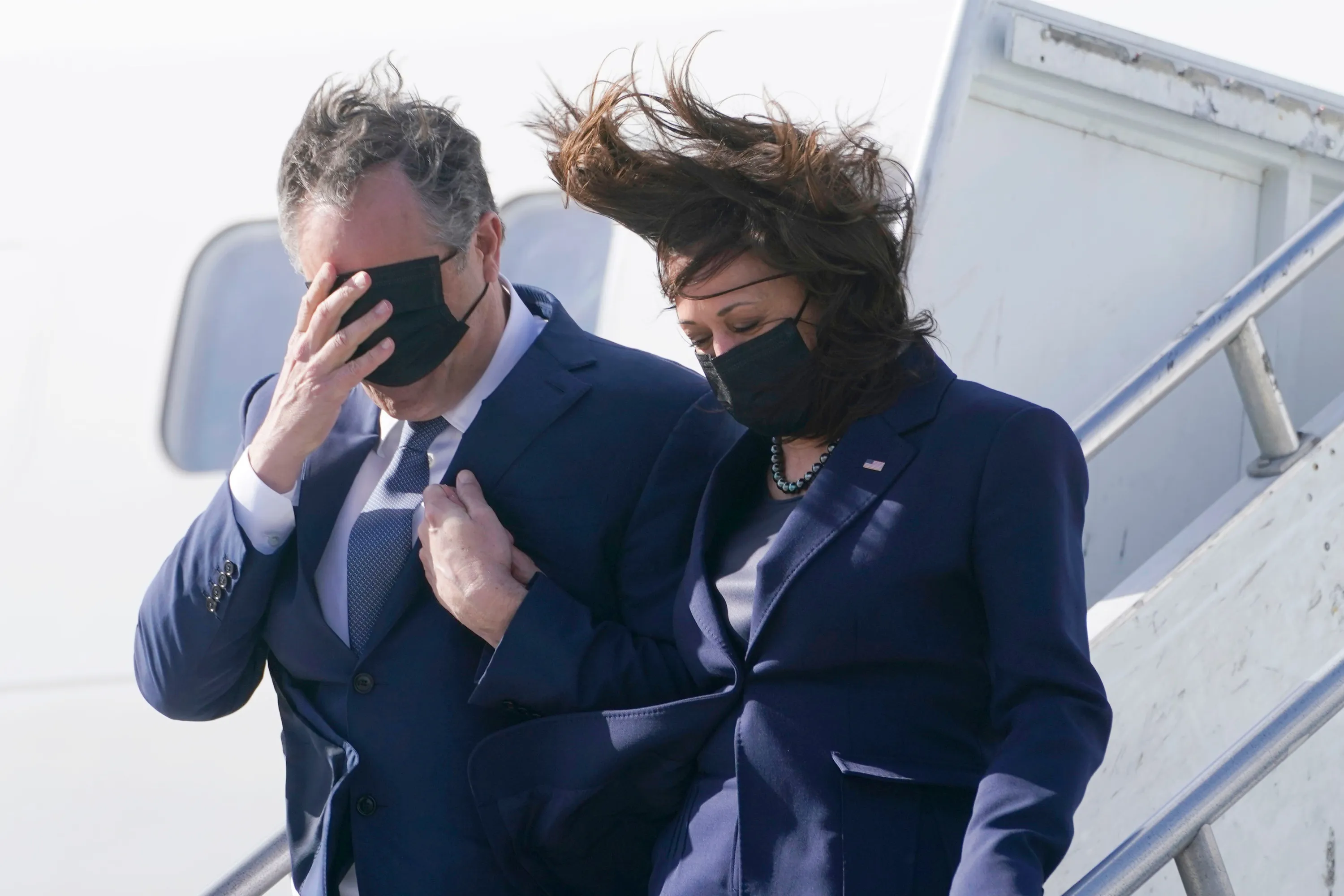 Vice President Kamala Harris and her husband Doug Emhoff, walk off Air Force Two on arrival to Los Angeles, Monday March 15, 2021. (Photo by Jacquelyn Martin/AP Photo)