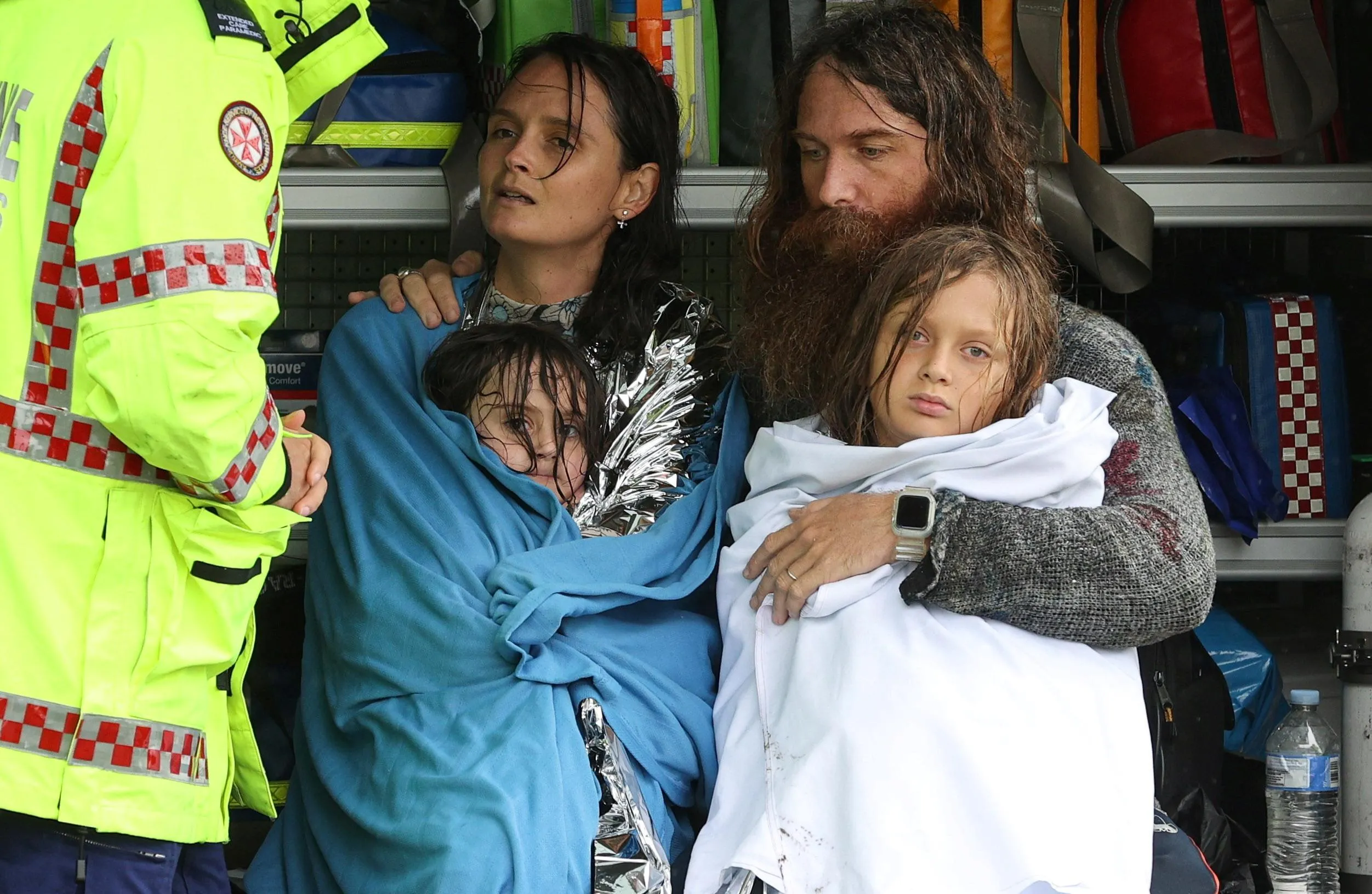A family receives medical attention after the Marine Rescue boat that rescued them from rising floodwaters capsized in strong currents, as the state of New South Wales experiences widespread flooding and severe weather, in the suburb of Sackville North in Sydney, Australia, March 23, 2021. (Photo by Loren Elliott/Reuters)