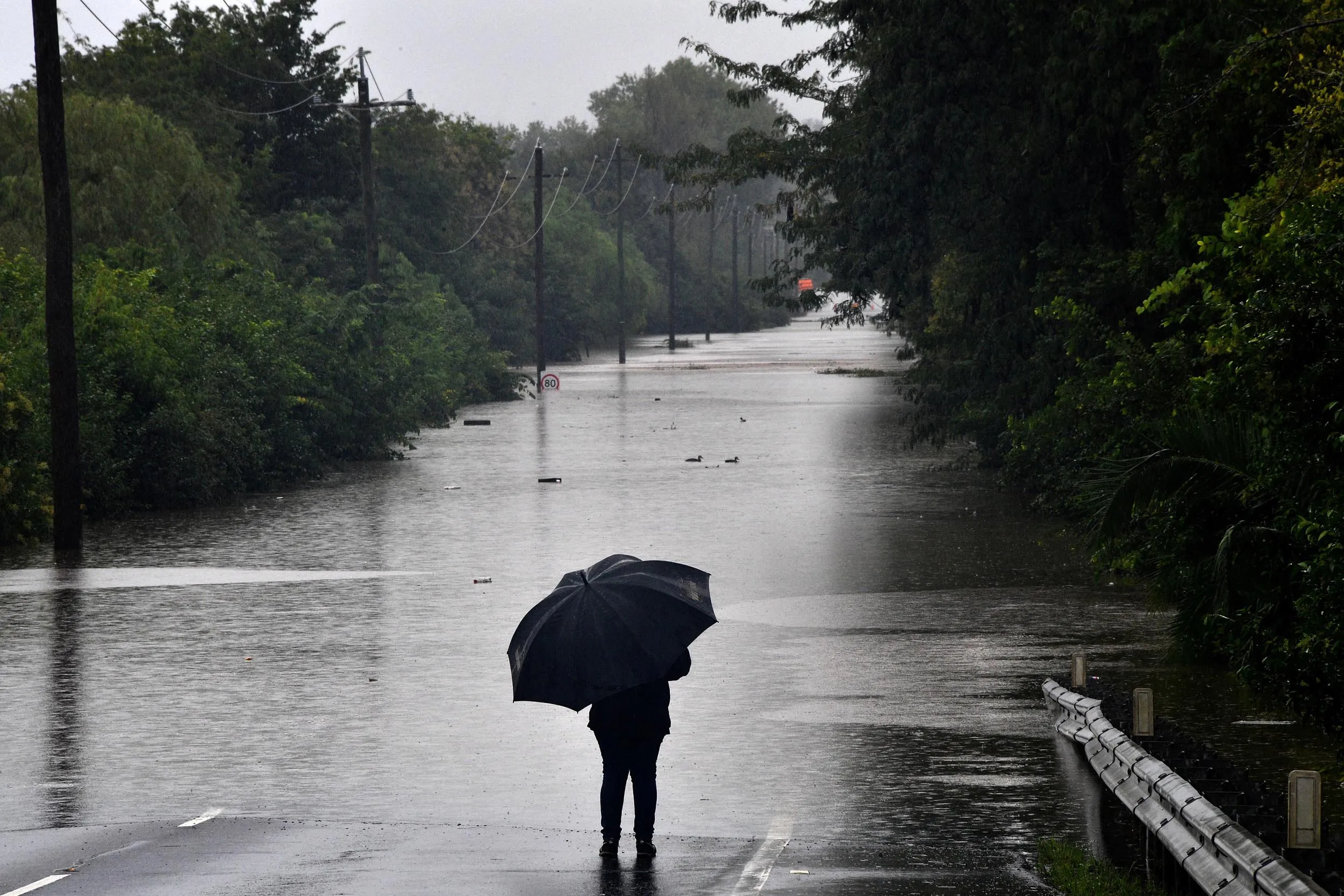 A man looks at a road inundated by floodwaters in Richmond suburb on March 22, 2021, as Sydney braced for its worst flooding in decades after record rainfall caused its largest dam to overflow and as deluges prompted mandatory mass evacuation orders along Australia's east coast. (Photo by Saeed Khan/AFP Photo)