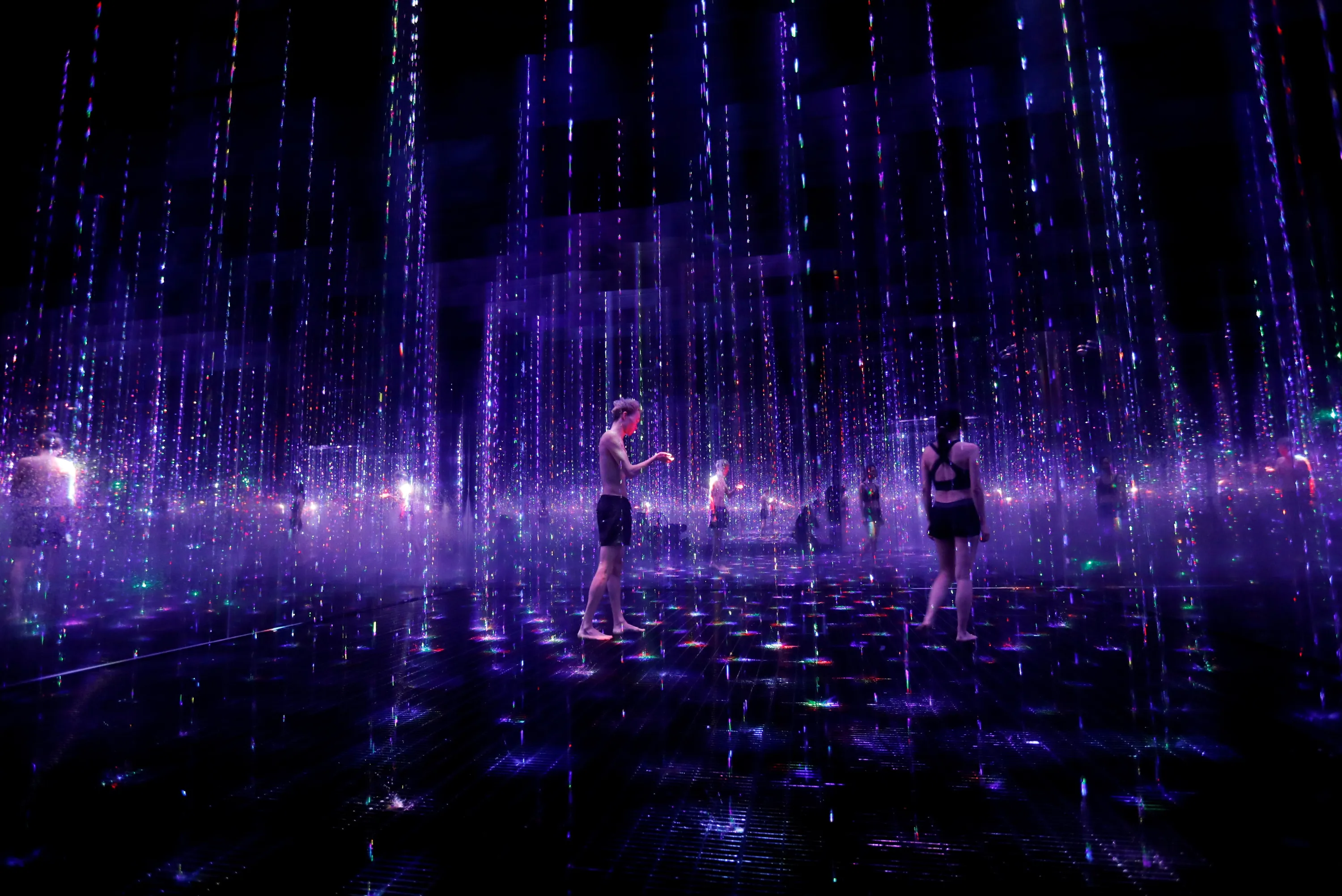 Staffs of teamLab wearing swimming suits walk inside digital artwork combined with light, water and sound during a demonstration of TikTok teamLab Reconnect, digital artwork combined with sauna, ahead of its opening to the public this month in Tokyo, Japan, March 13, 2021. (Photo by Kim Kyung-Hoon/Reuters)