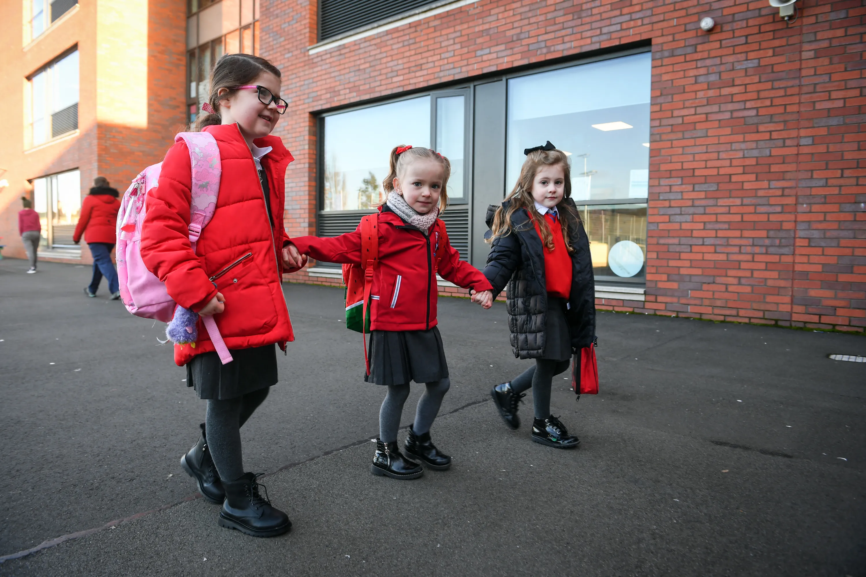 Pupils arrive at Clyde Primary School in Glasgow on February 22, 2021 as schools in Scotland started to reopen to more of the youngest students in an easing of the coronavirus shutdown. (Photo by Andy Buchanan/AFP Photo)