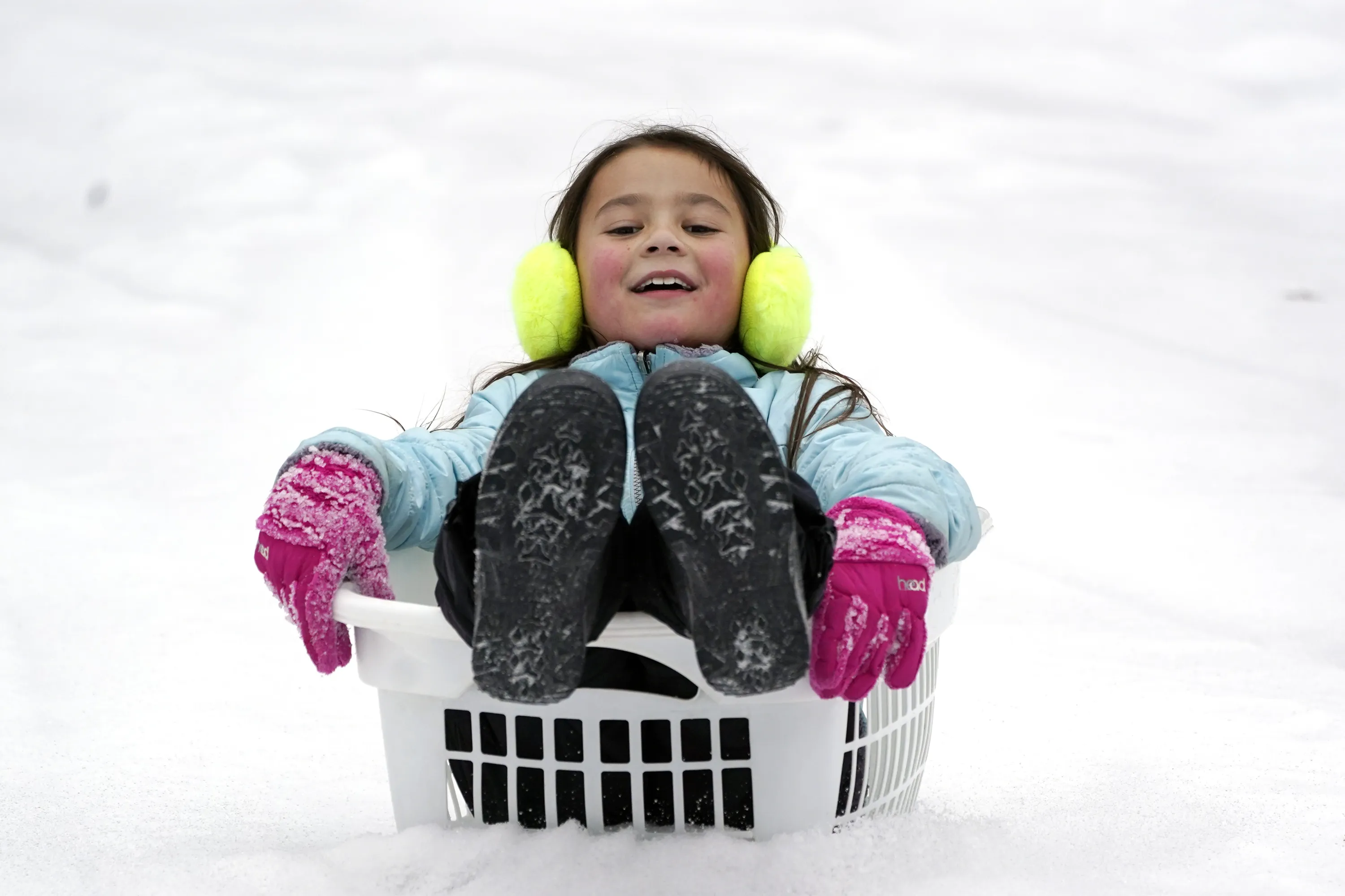 Peyton McKinney uses a laundry basket for a sled Monday, February 15, 2021, in Nolensville, Tenn. Much of Tennessee was hit with a winter storm that brought freezing rain, snow, sleet and freezing temperatures. (Photo by Mark Humphrey/AP Photo)
