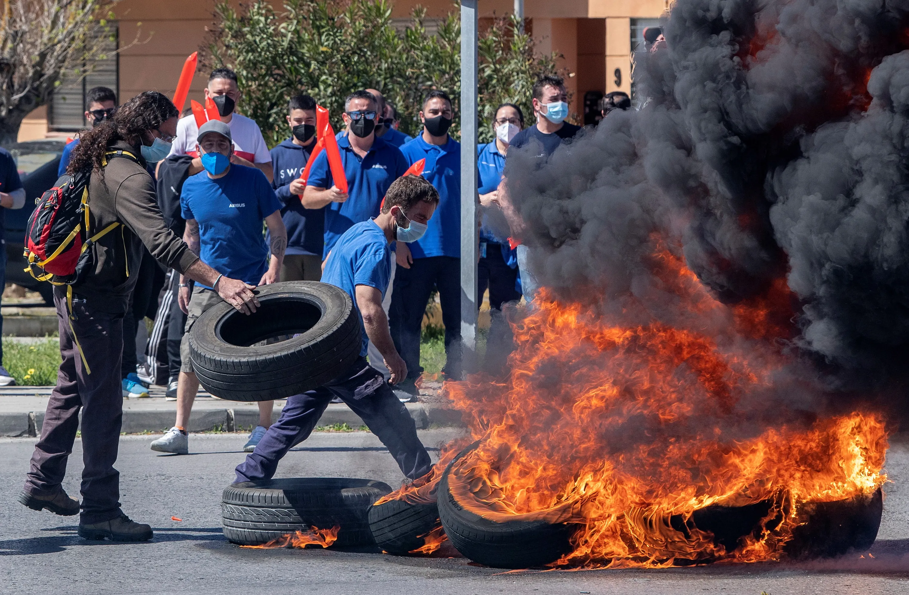 People burn tires to make a barricade during rally to demand the Airbus's plant remain open in the town of Puerto Real, in Cadiz, southern Spain, 24 March 2021. A group of some 1,000 people protested as workers try to avoid the shutting down of the plant that provides direct employment to 400 people and more than 1,000 indirect jobs. (Photo by Roman Rios/EPA/EFE)