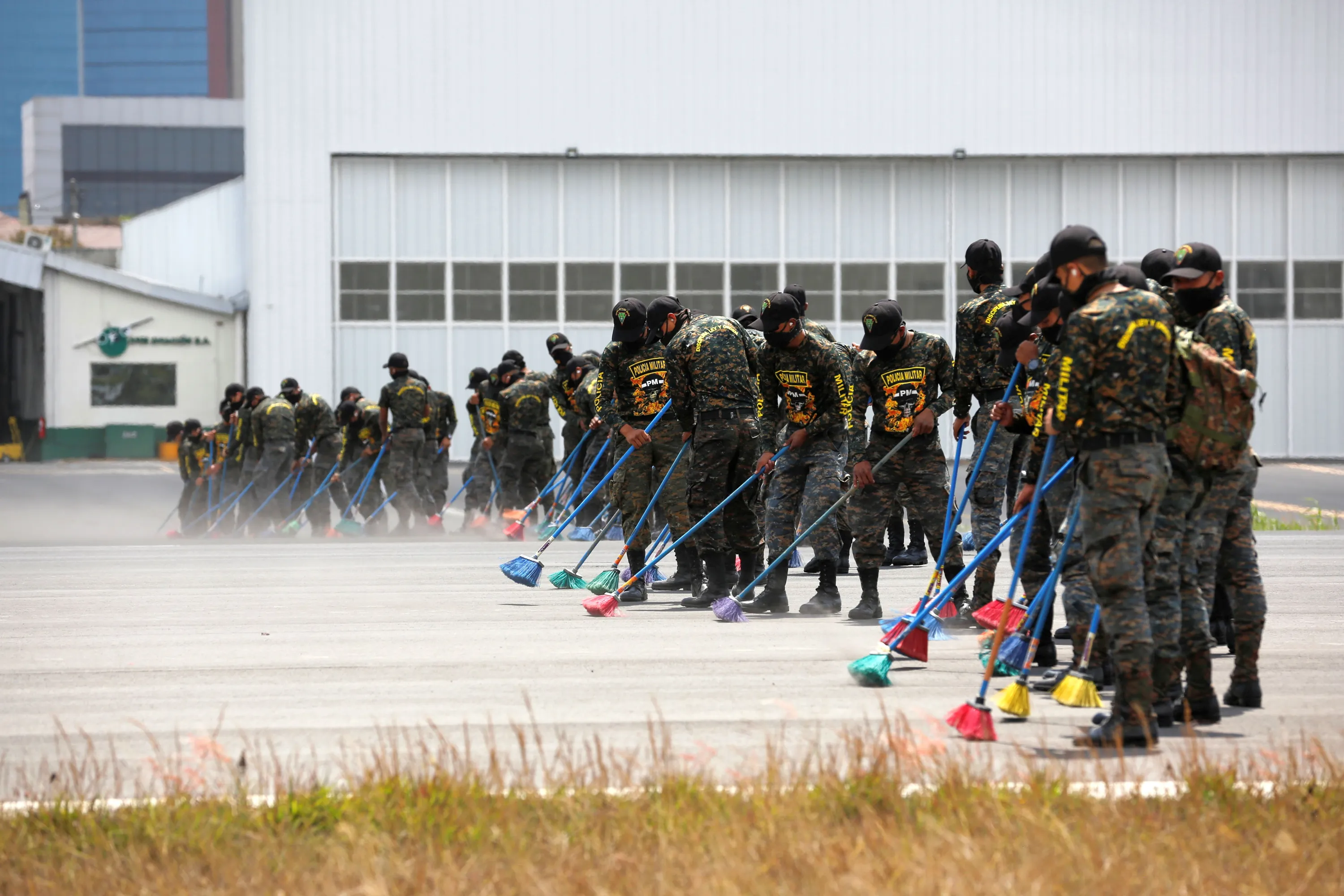 Soldiers sweep ashes from the Pacaya volcano at the tarmac of La Aurora International Airport in Guatemala City, Guatemala, March 23, 2021. (Photo by Luis Echeverria/Reuters)
