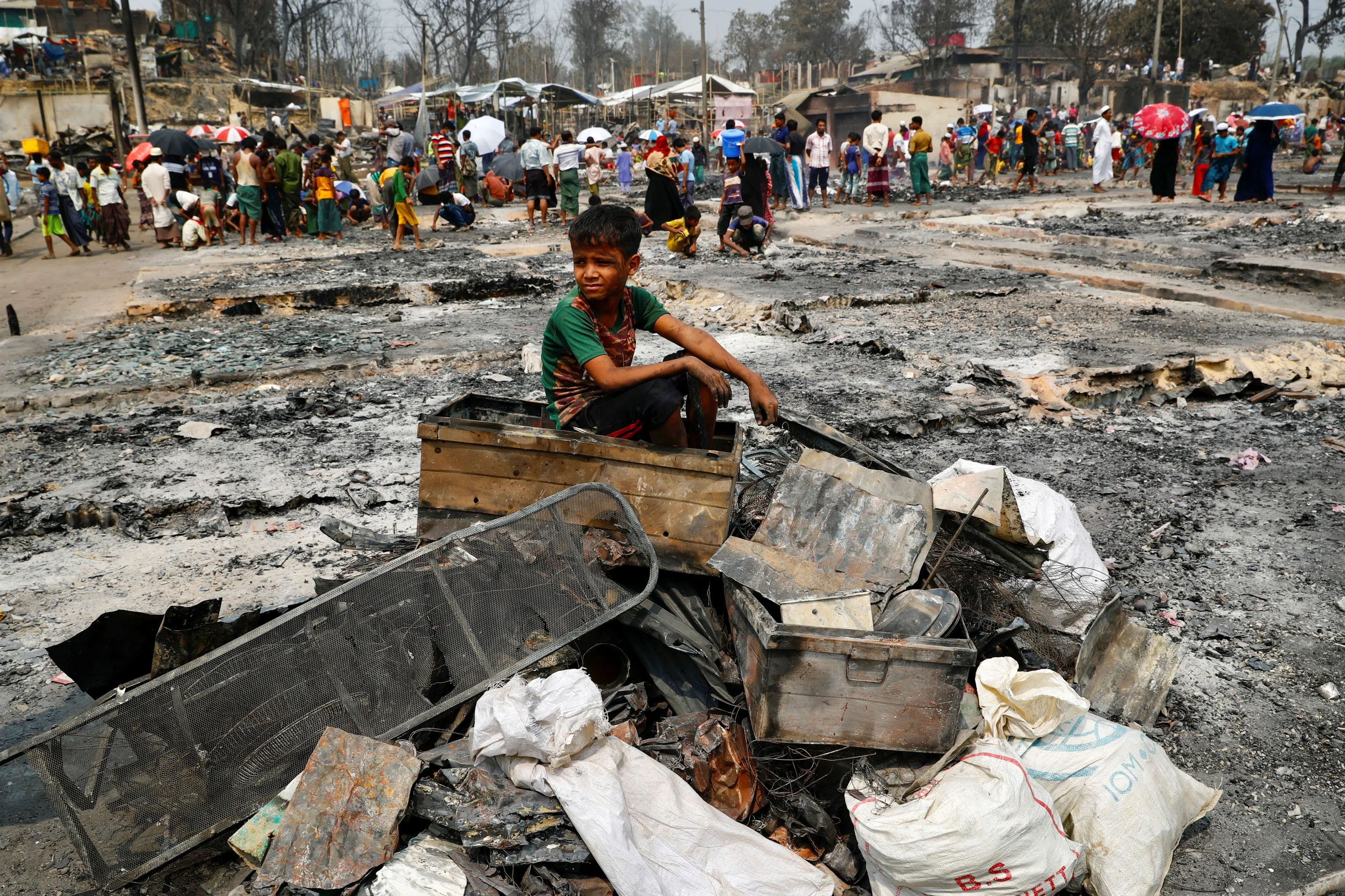 A Rohingya refugee boy sits on a stack of burned material after a massive fire broke out and destroyed thousands of shelters in a Rohingya refugee camp in Cox's Bazar, Bangladesh, March 24, 2021. (Photo by Mohammad Ponir Hossain/Reuters)