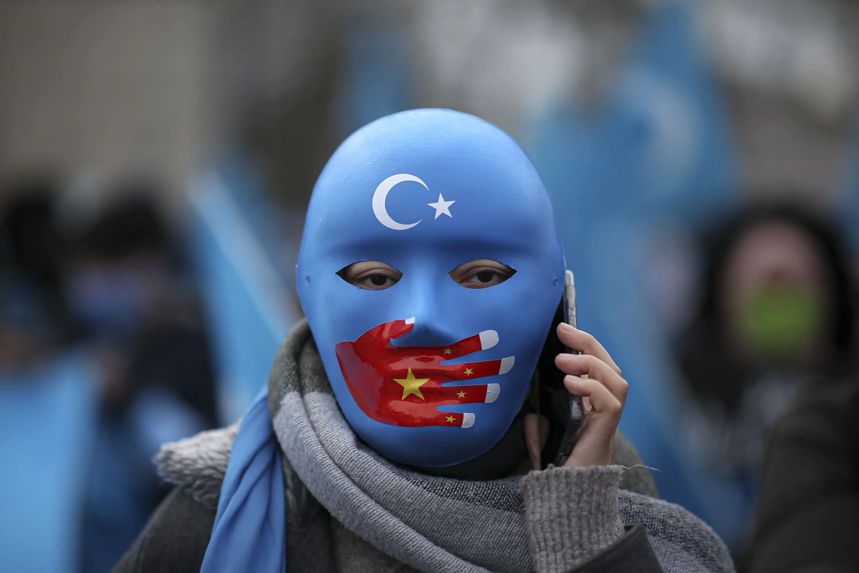 A protester from the Uyghur community living in Turkey, wearing a mask with a Chinese flag uses a mobile phone during a protest in Istanbul, Thursday, March 25, against against the visit of China's FM Wang Yi to Turkey. Hundreds of Uyghurs staged protests in Istanbul and the capital Ankara, denouncing Wang Yi's visit to Turkey and demanding that the Turkish government take a stronger stance against human rights abuses in China's far-western Xinjiang region. (Photo by Emrah Gurel/AP Photo)