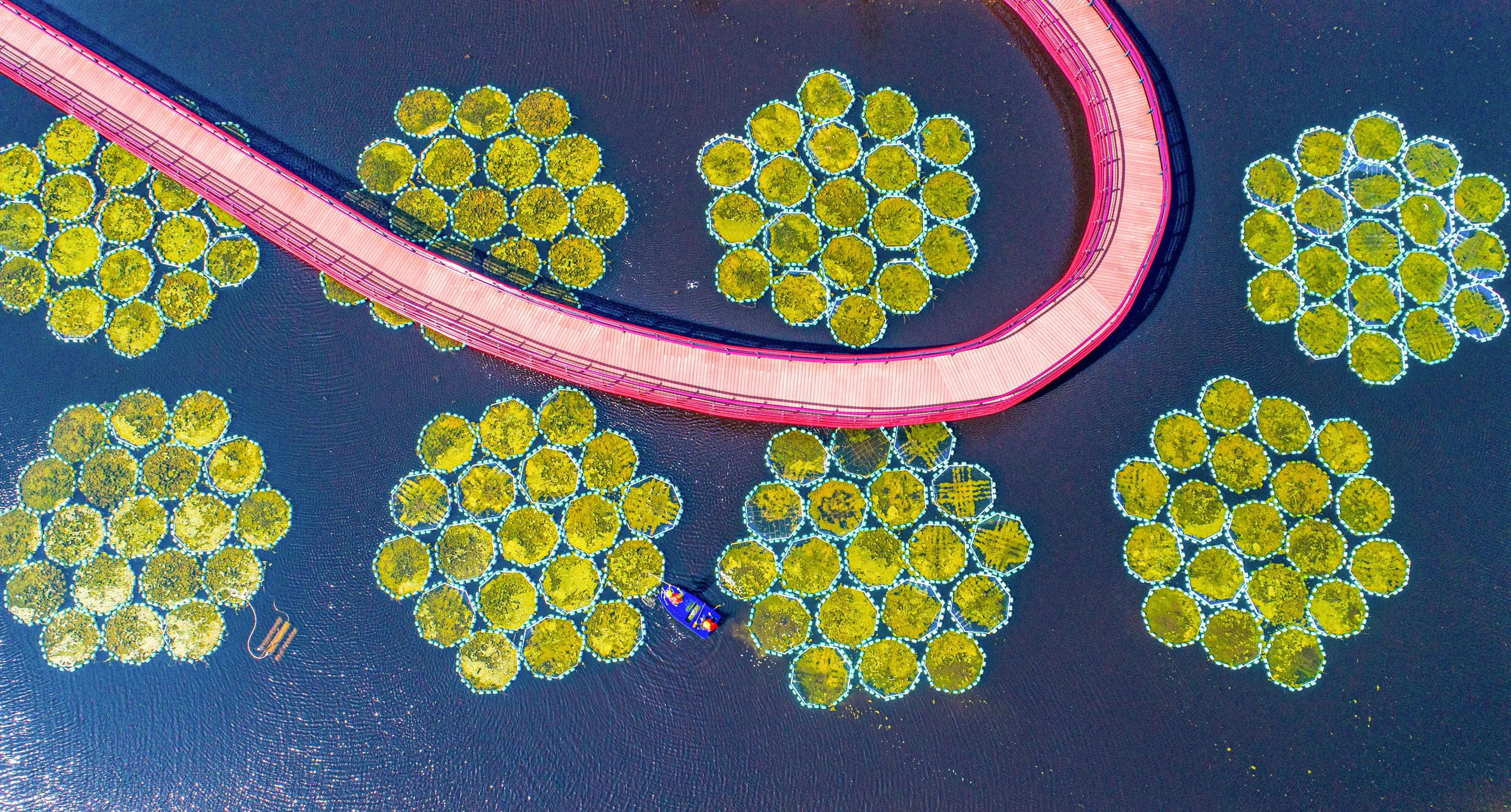 This aerial photo taken on March 21, 2021 shows workers maintaining plants at a park in Haian in China's eastern Jiangsu province. (Photo by AFP Photo/China Stringer Network)