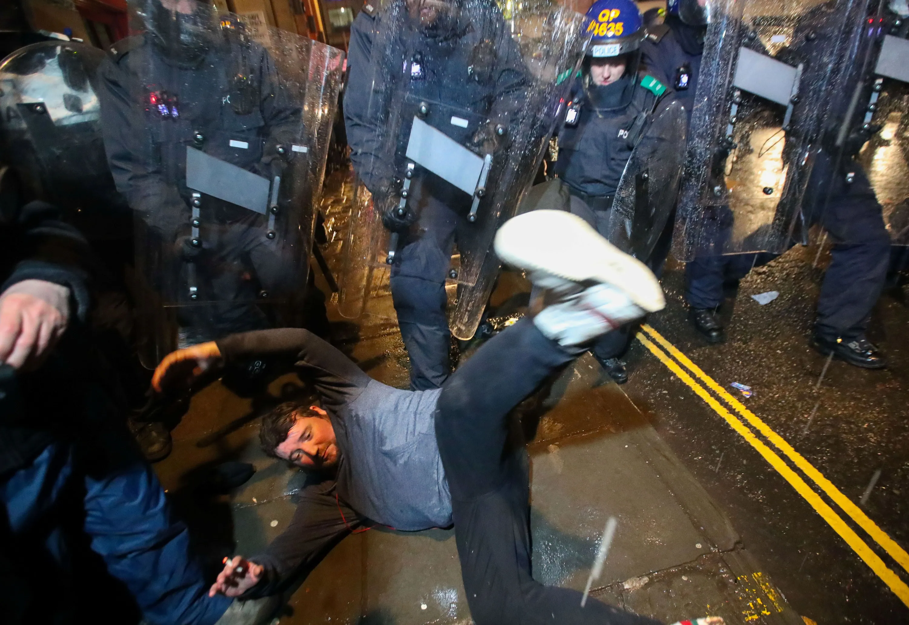A demonstrator falls during a clash with police officers at a protest against a newly proposed policing bill, in Bristol, Britain, March 26, 2021. (Photo by Peter Cziborra/Reuters)