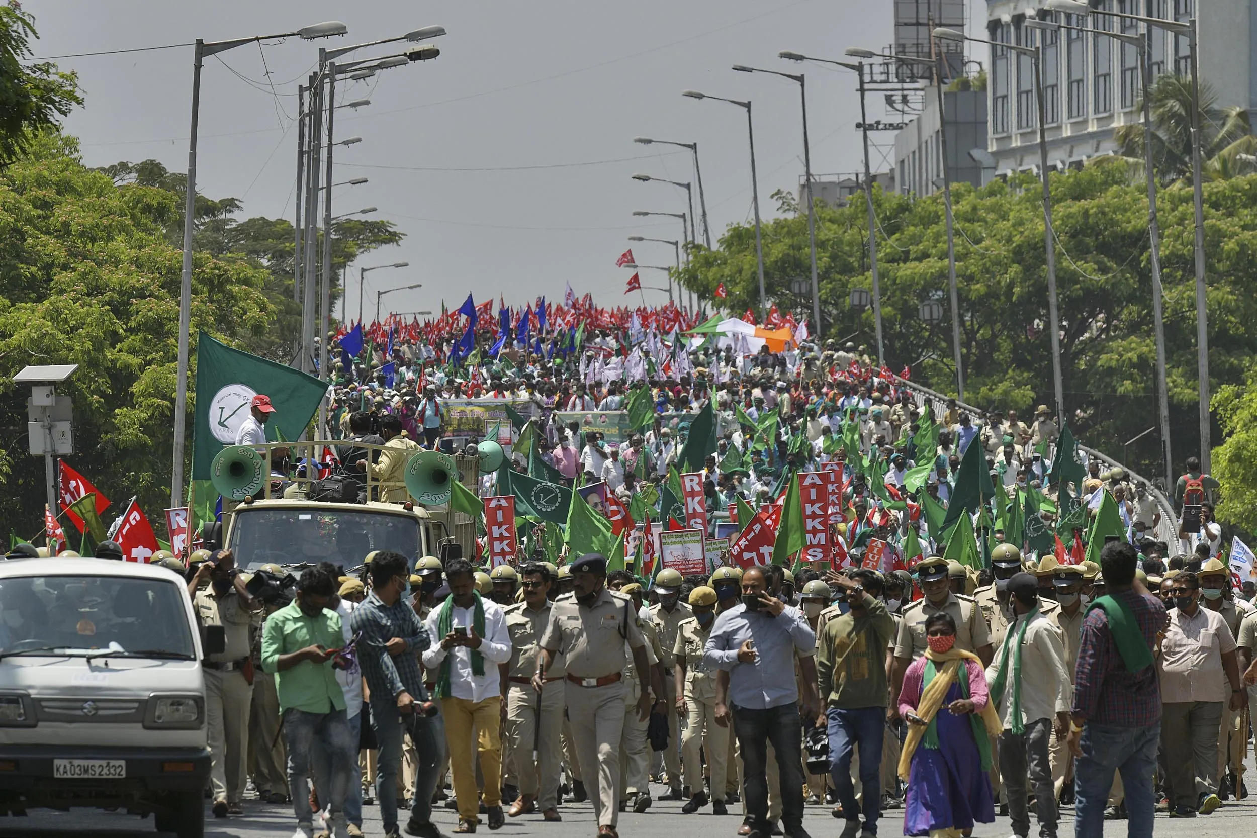 Police personnel march in front of activists of pro-farmer organisations during a protest rally supporting the ongoing farmers' protest against the central government's recent agricultural reforms, in Bangalore on March 22, 2021. (Photo by Manjunath Kiran/AFP Photo)