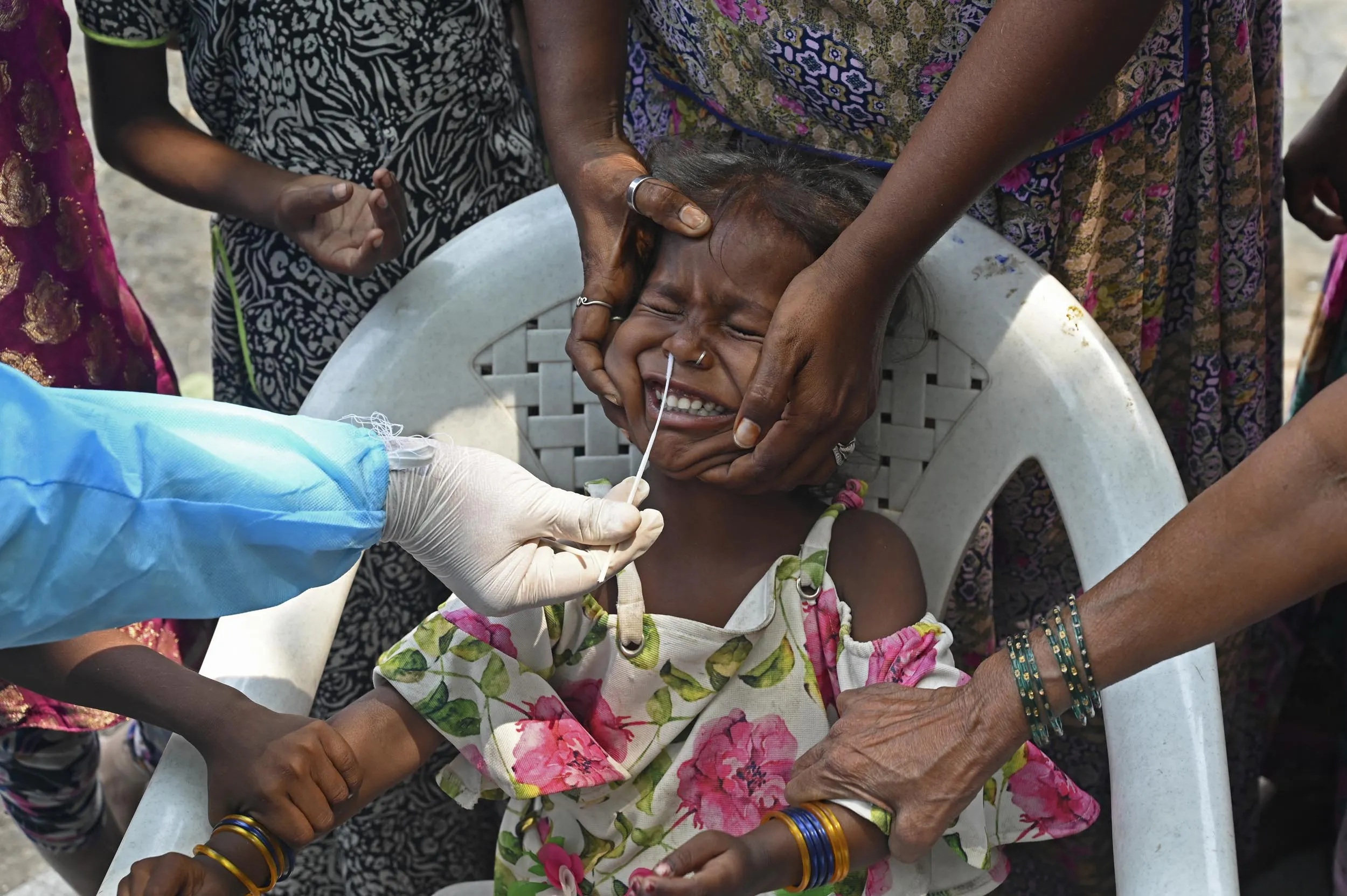 A girl reacts as a health worker takes her nasal swab sample for Covid-19 coronavirus Rapid Antigen Test (RAT) as mandated by the civic authorities in Mumbai on March 22, 2021. (Photo by Indranil Mukherjee/AFP Photo)