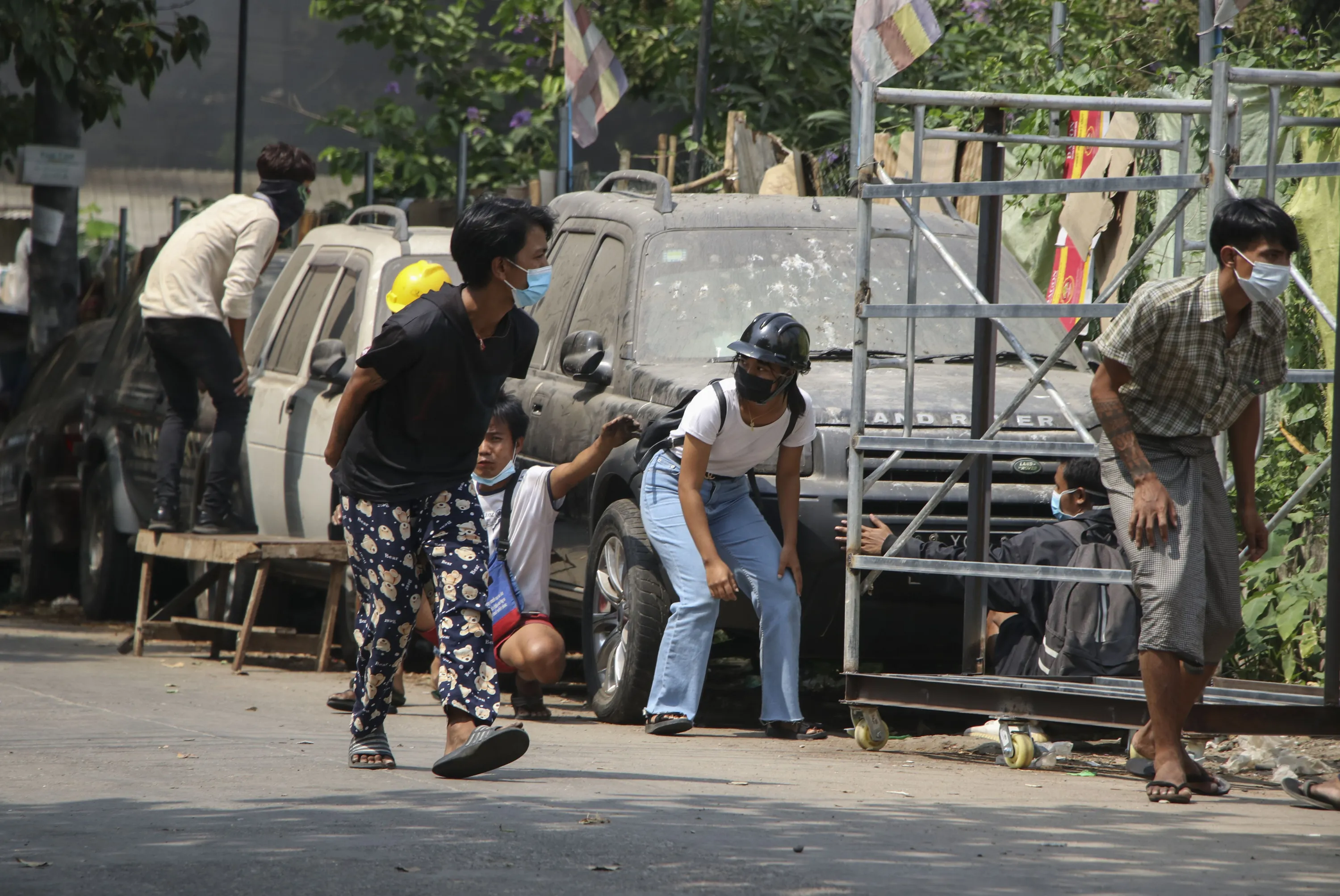 Anti-coup protesters take cover behind parked vehicles as they confront police at Hlaing township in Yangon, Myanmar, Sunday, March 28, 2021. Protesters in Myanmar returned to the streets Sunday to press their demands for a return to democracy, just a day after security forces killed more than 100 people in the bloodiest day since last month's military coup. (Photo by AP Photo/Stringer)