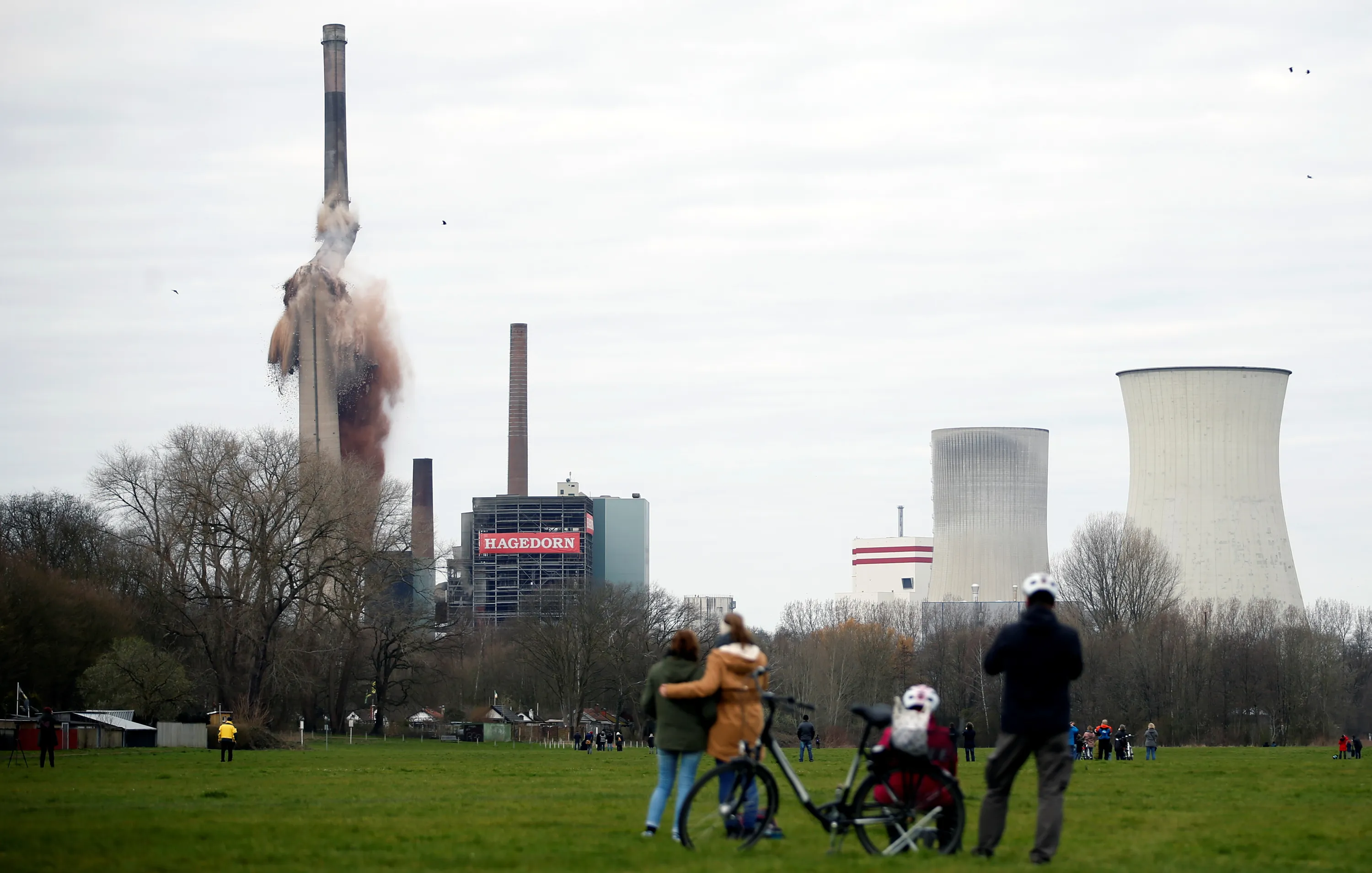 People watch as a former power plant is destroyed via controlled explosion in Luenen, Germany on March 28, 2021. (Photo by Leon Kuegeler/Reuters)