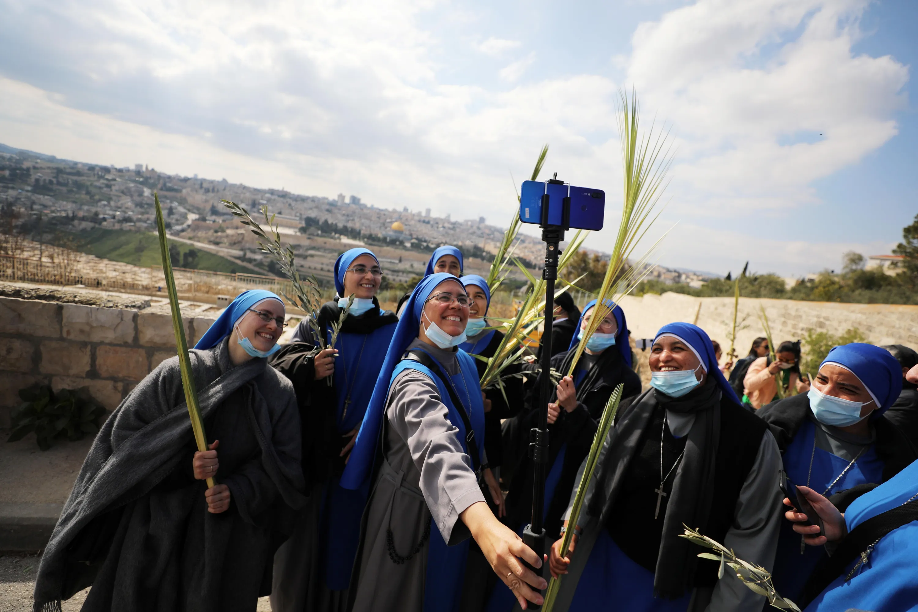 Christian nuns take a selfie while they hold palm fronds as they take part in a Palm Sunday procession on the Mount of Olives in Jerusalem on March 28, 2021. (Photo by Ammar Awad/Reuters)