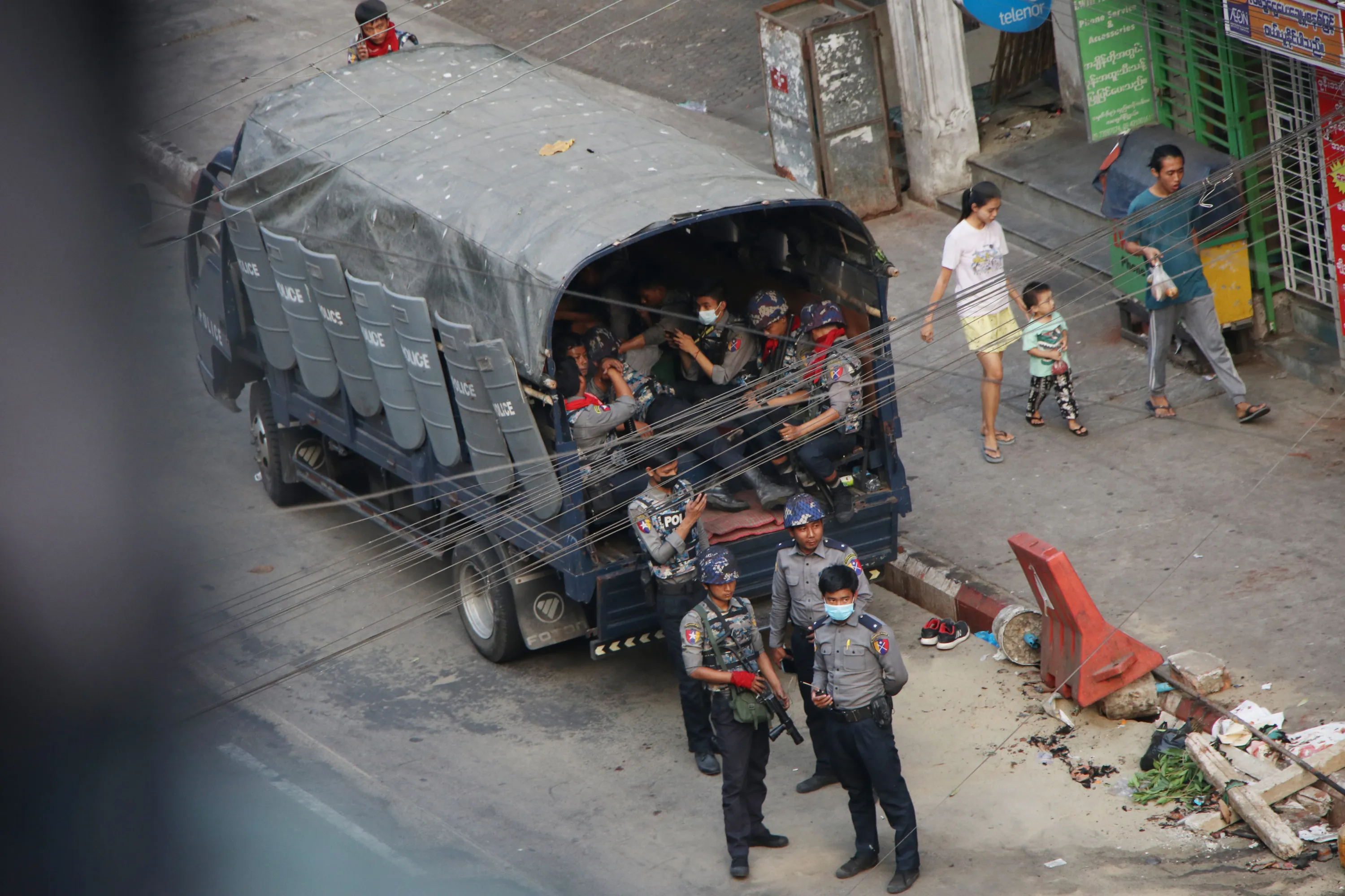 Security forces stand by on Hledan road in Kamayut township of Yangon in Myanmar, Monday, March 29, 2021. (Photo by AP Photo/Stringer)