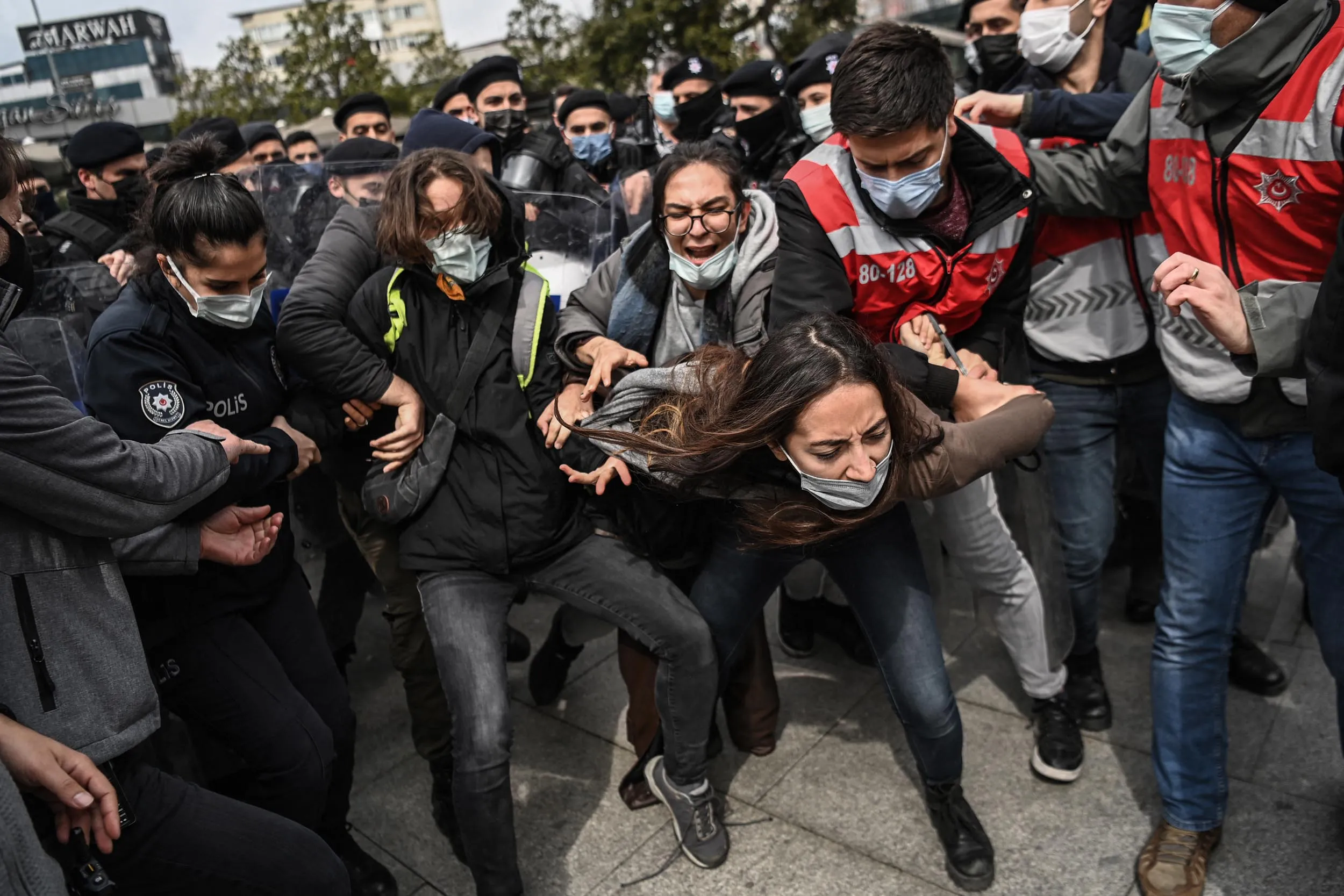 Turkish anti riot police officers detain a group of protesters during a demonstration in support of Bogazici University students – arrested as they were protesting against the nomination of a university rector appointed by the Turkish President – in front of the Istanbul's courthouse, in Istanbul, on March 26, 2021. (Photo by Ozan Kose/AFP Photo)