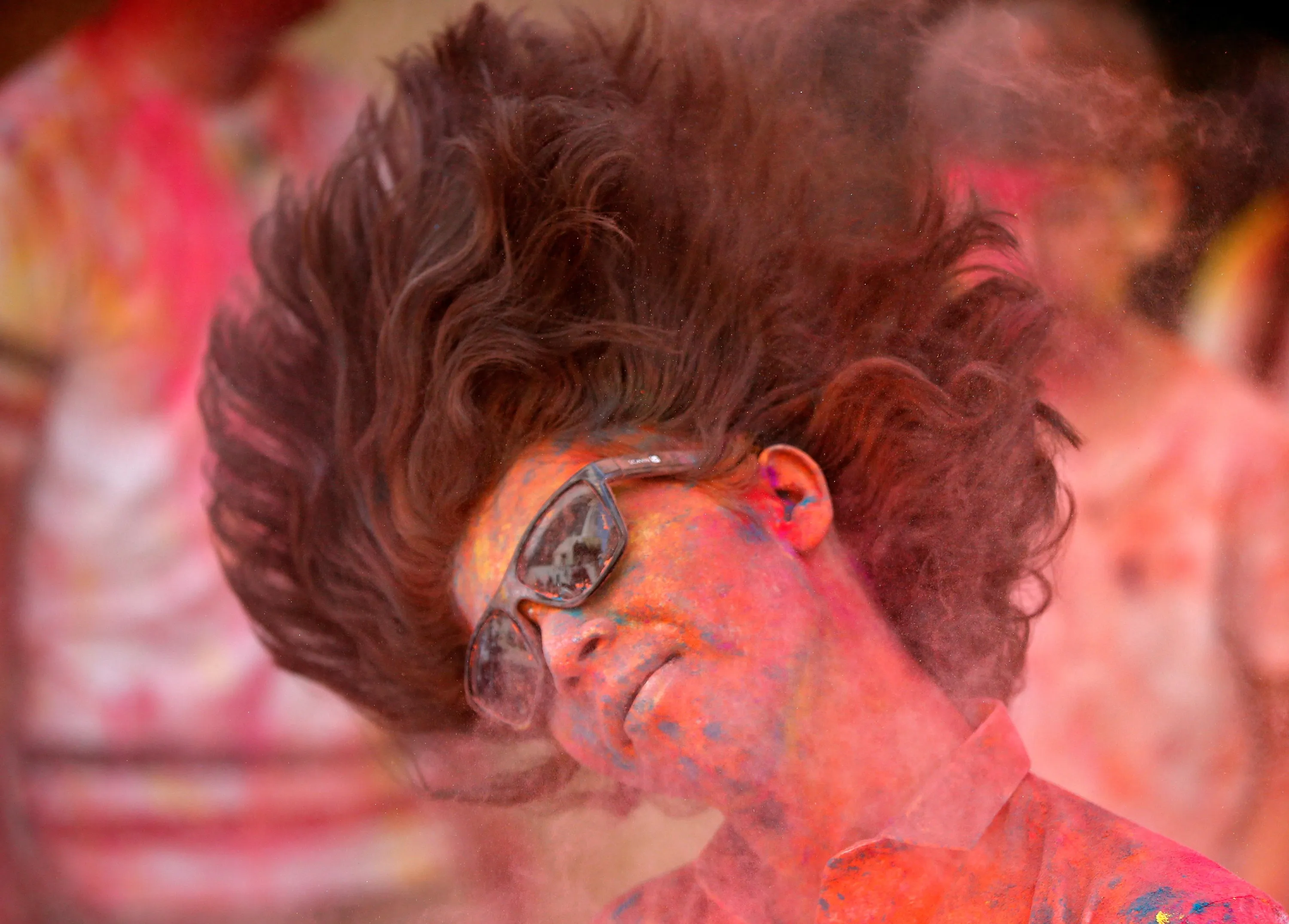 A boy smeared with coloured powder shakes his head to remove it during Holi celebrations, amidst the spread of the coronavirus disease (COVID-19), in Ahmedabad, India, March 29, 2021. (Photo by Amit Dave/Reuters)