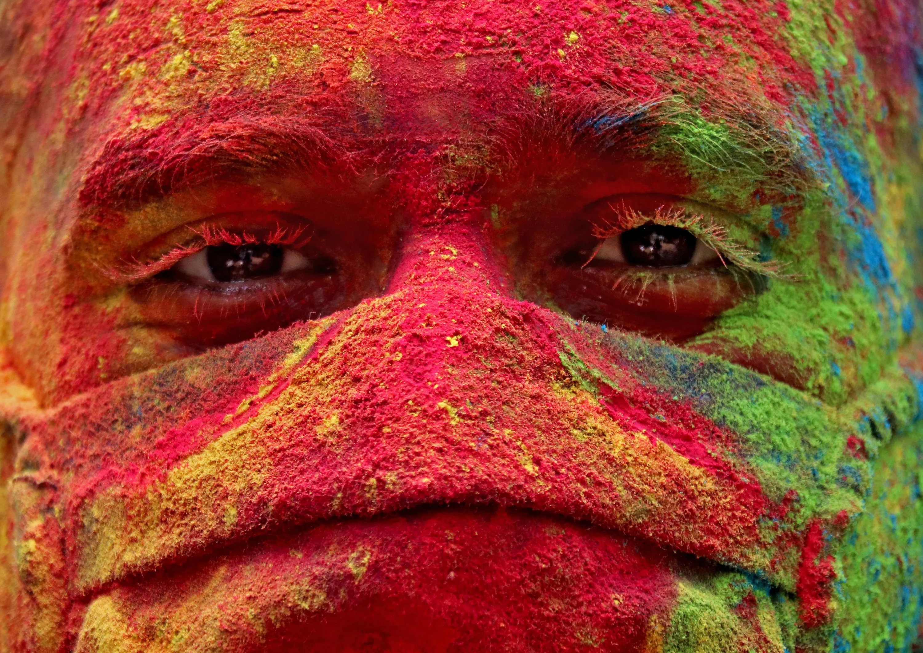 A man wearing a protective face mask daubed in looks on during Holi celebrations, amidst the spread of the coronavirus disease (COVID-19), in Mumbai, India, March 29, 2021. (Photo by Niharika Kulkarni/Reuters)