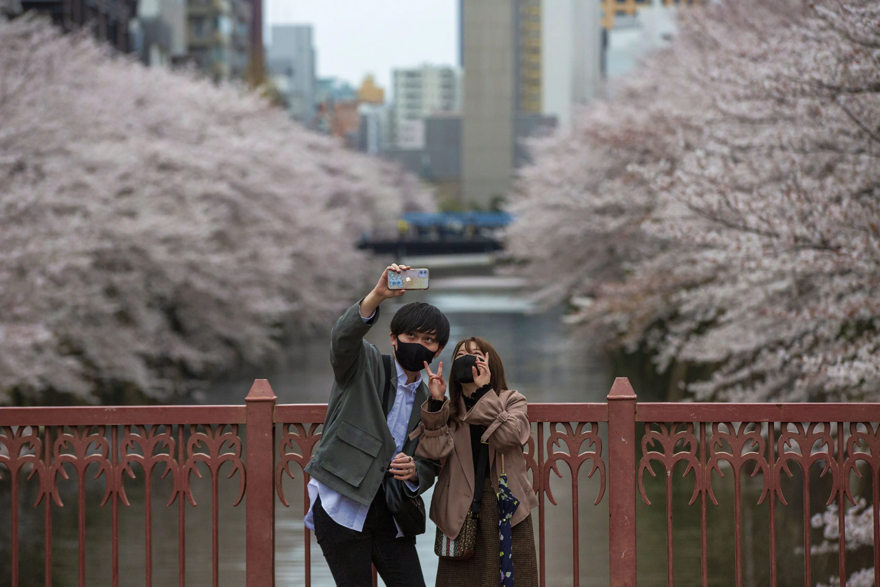 People wearing protective masks to help curb the spread of the coronavirus take a selfie on a bridge as cherry blossoms bloom over Meguro River Sunday, March 28, 2021, in Tokyo. Cherry blossoms in many parts of Japan used to reach its prime in April just as the country celebrates the start of its new school and business year. Today, they bloom earlier in the spring and are mostly gone for the occasion, most likely because of the climate change. (Photo by Kiichiro Sato/AP Photo)