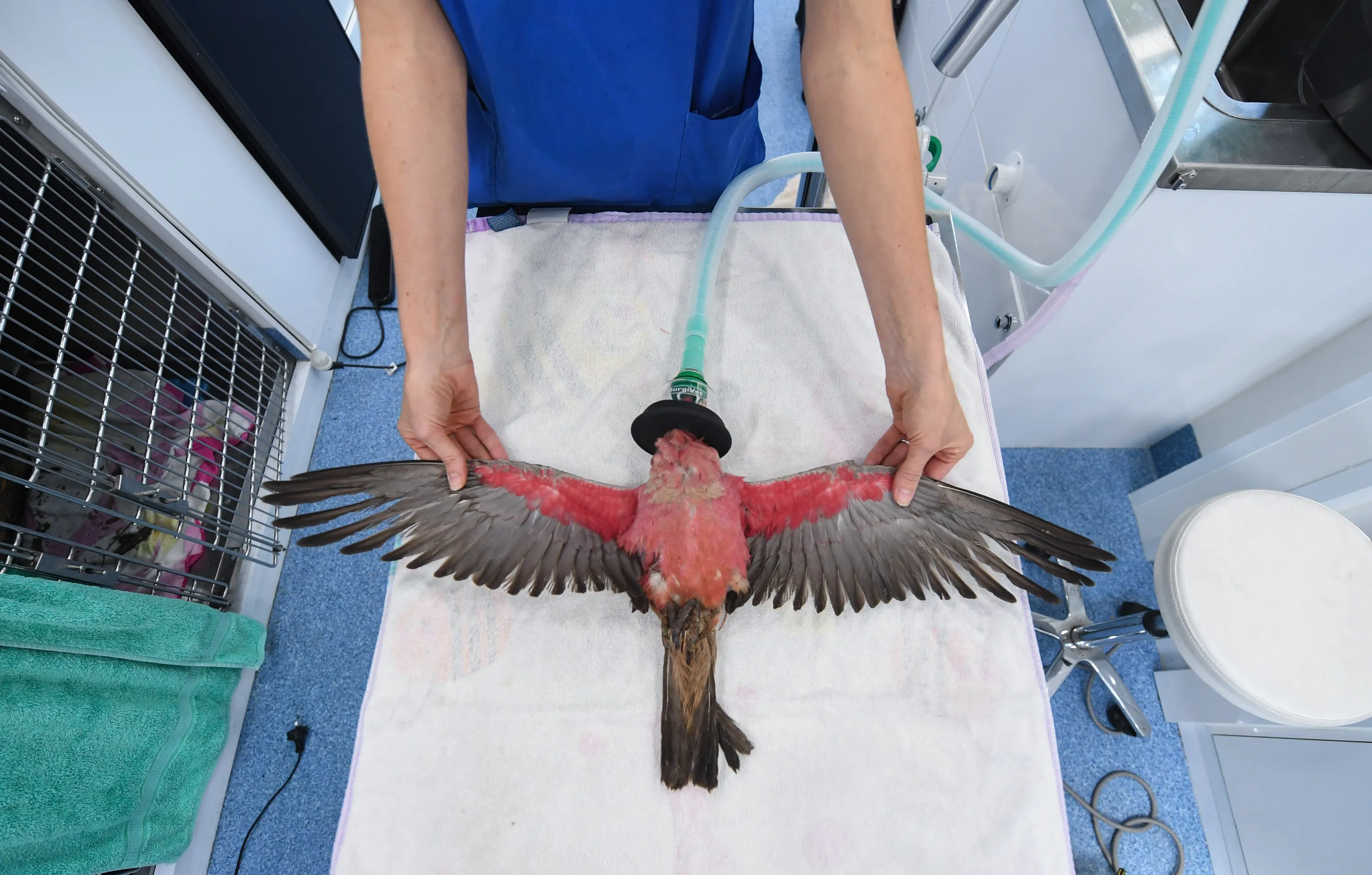 An Australian Galah, also known as the pink and grey cockatoo is attended to in the Byron Bay Mobile Wildlife Hospital having been found injured on the ground after heavy rain on March 24, 2021 in Byron Bay, Australia. Extreme weather has caused extensive flooding across New South Wales following days of sustained rain and reports are now emerging of ground-dwelling animals such as echidnas and wombats being trapped underground or being hit by cars when moving to higher ground. Situated at Australia's eastern-most point, the vet team are seeing increasing caseloads of native wildlife presenting with injuries from the floods. The not for profit veterinary organisation is advising the public to be alert to the perils facing wildlife as recovery and cleanup efforts get underway. (Photo by James D. Morgan/Getty Images)