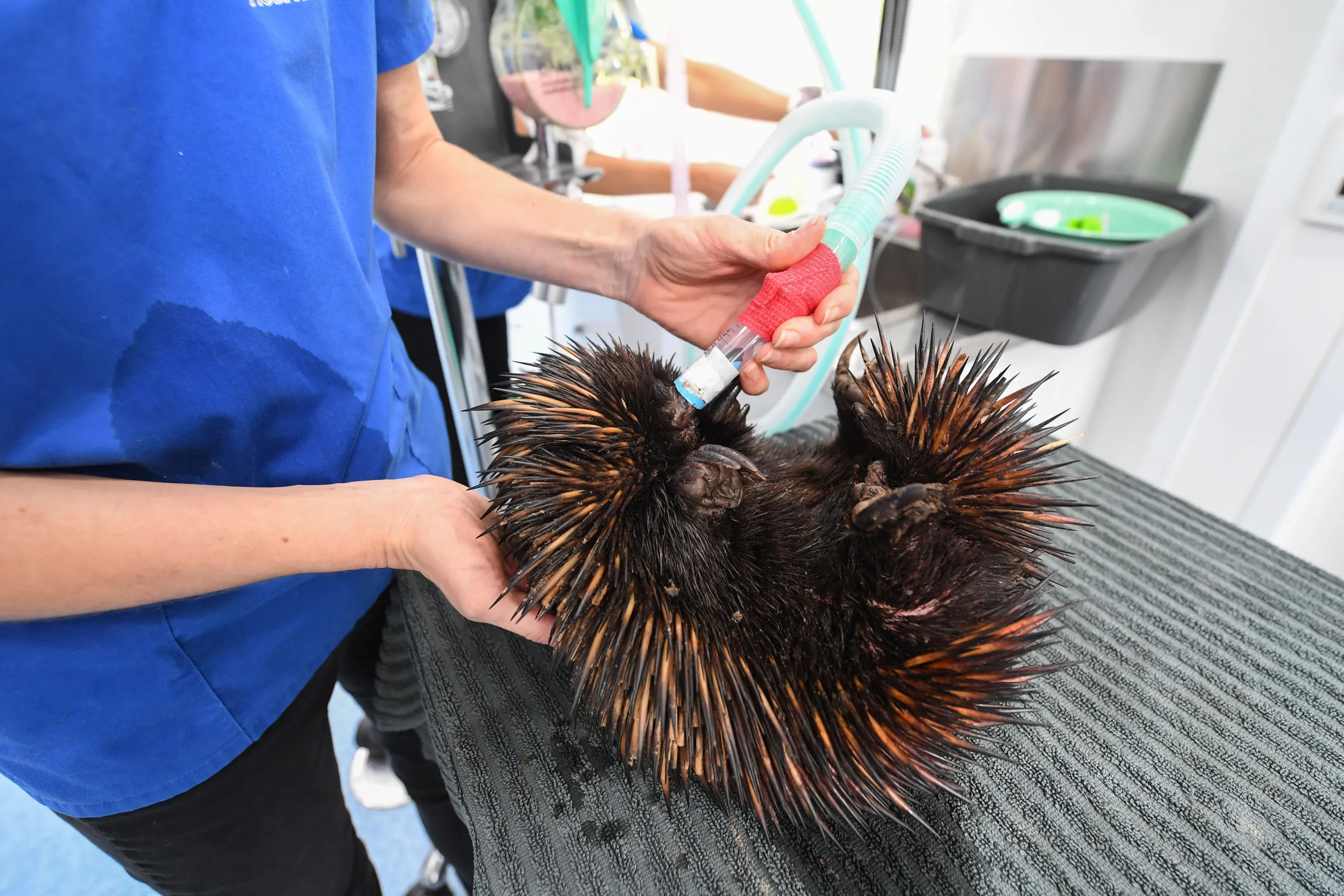 An echidna is attended to in the Byron Bay Mobile Wildlife Hospital having been found injured beside a road escaping to higher ground after heavy rain on March 24, 2021 in Byron Bay, Australia. (Photo by James D. Morgan/Getty Images)